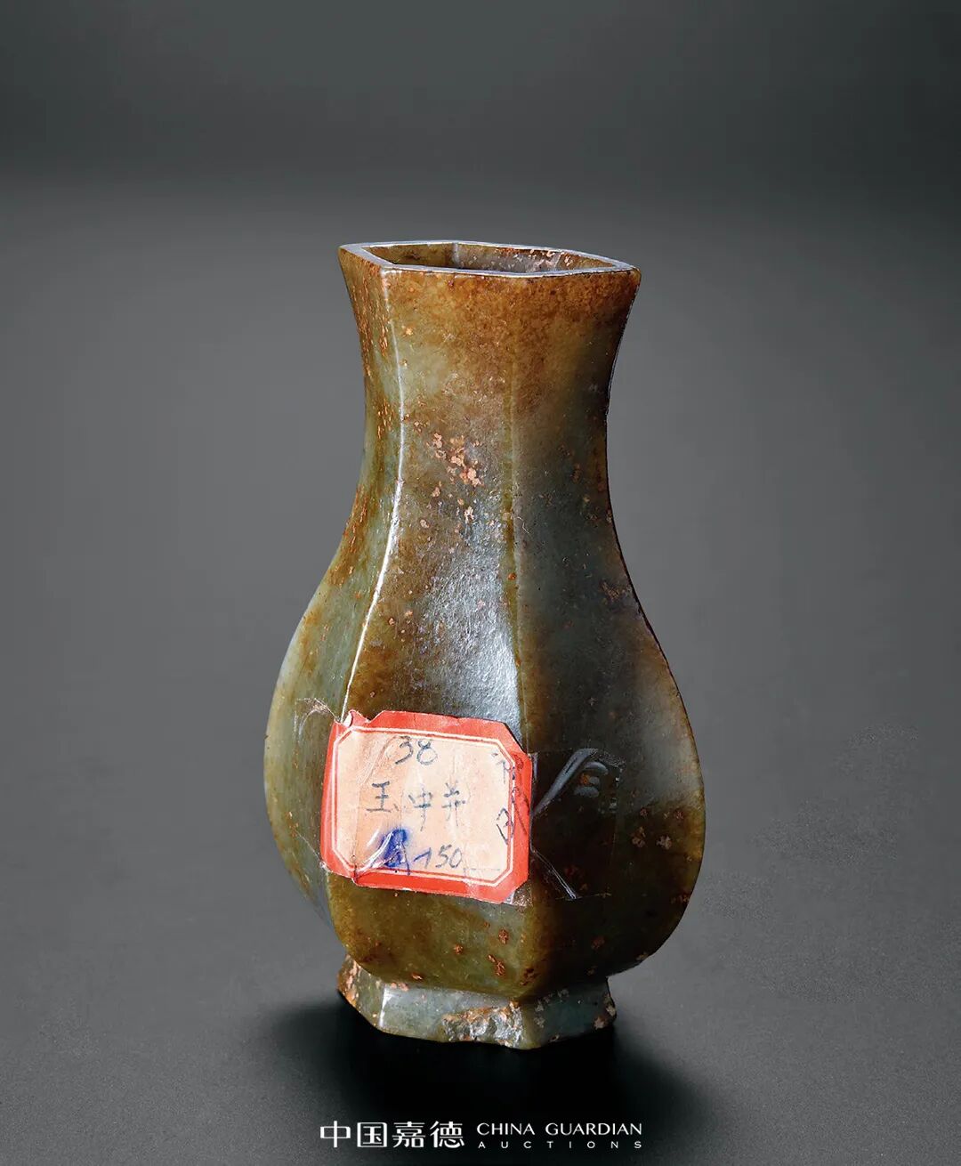 明旧玉六方小瓶(lot2525)呈六方形,身随口形,造型简洁,布满沁色,古意盎然,光素无纹饰,起棱线条比例精准,琢磨圆润,由此可见制作者的精湛工艺。玉瓶虽器身小巧,握于手中却显得厚重,实为在足部处理中,保留了玉材,做平底处理而非圈足所致。适置于案头与古砚为伴,相得益彰。