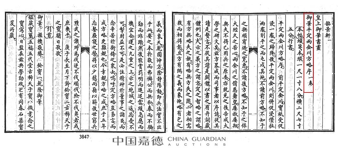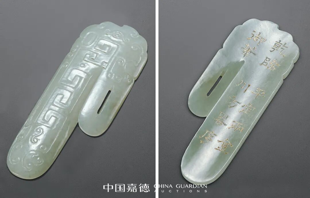 清乾隆白玉“平定两金川方略序”别子(lot 2859)背部划刻并描金“乾隆御笔”、“平定两金川方略序”。根据《秘殿珠林石渠宝笈合编》(卷七)记载,在韶景轩曾存放着一卷纵一尺一寸八分(约39公分),横二尺七寸五分(约91公分)行书《御笔平定两金川方略序》手卷一卷,此件玉别推测为此手卷所用。
