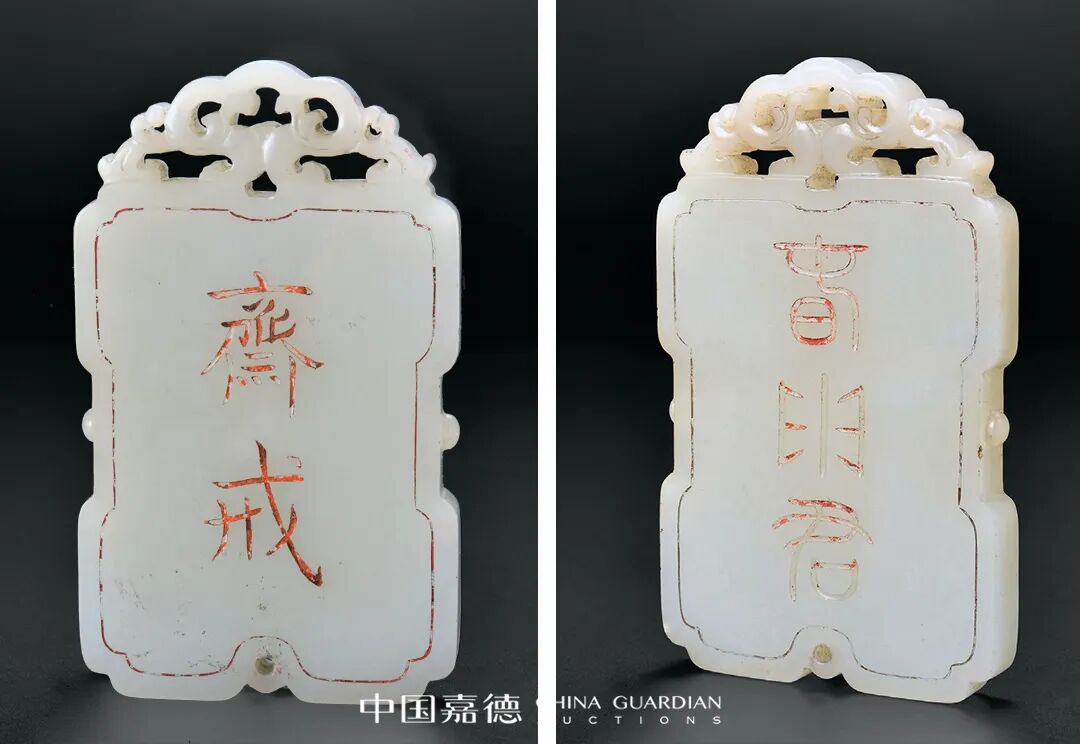 清早期白玉大斋戒牌(lot2516)较之以往常见同类斋戒牌,不仅尺寸大,且用料厚实。无多装饰,仅以牌首镂雕花卉呈悬挂状,牌整体呈长方形,浅刻开光内一面楷书“斋戒”二字,笔体有力,刻划规矩。背面篆书“春申君”三字,春申君即楚国黄歇,他与齐国孟尝君田文、赵国平原君赵胜、魏国信陵君魏无忌,史称“战国四君子”。牌双面字口内均可依稀见朱砂痕迹。