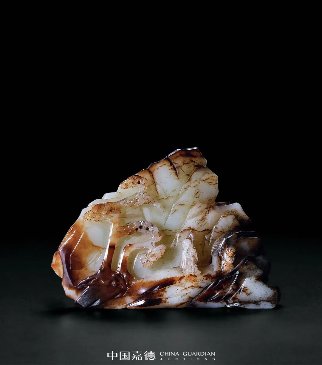 玉山子作为室内陈设,在清代宫廷十分流行,既有硕大重达万斤的大禹治水图山子,也有精巧雅致的案头陈设,特别是清代中期,随着和田玉的开发及大量供给,琢刻描述画意性、故事性的玉雕形式到达高峰,清乾隆玉沁色溪山行旅图小山子(lot2529)即为此类代表。本品造型小巧,玉质油润细腻,以浮雕作景,松树耸立,高士倚仗前行,小童肩背灵芝随后,刀法细致干练,木石人物层迭。加之材质本身的沁色,方显意境深远,进退幽深;古松健拔,人事悠悠。峰石嶙峋,仙境之地呼之欲出。山子背面只寥寥数刀,展示山石嶙峋,一隅之处灵芝一朵,给人以无限想象的空间,动静有常,虚实相间。