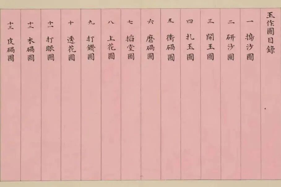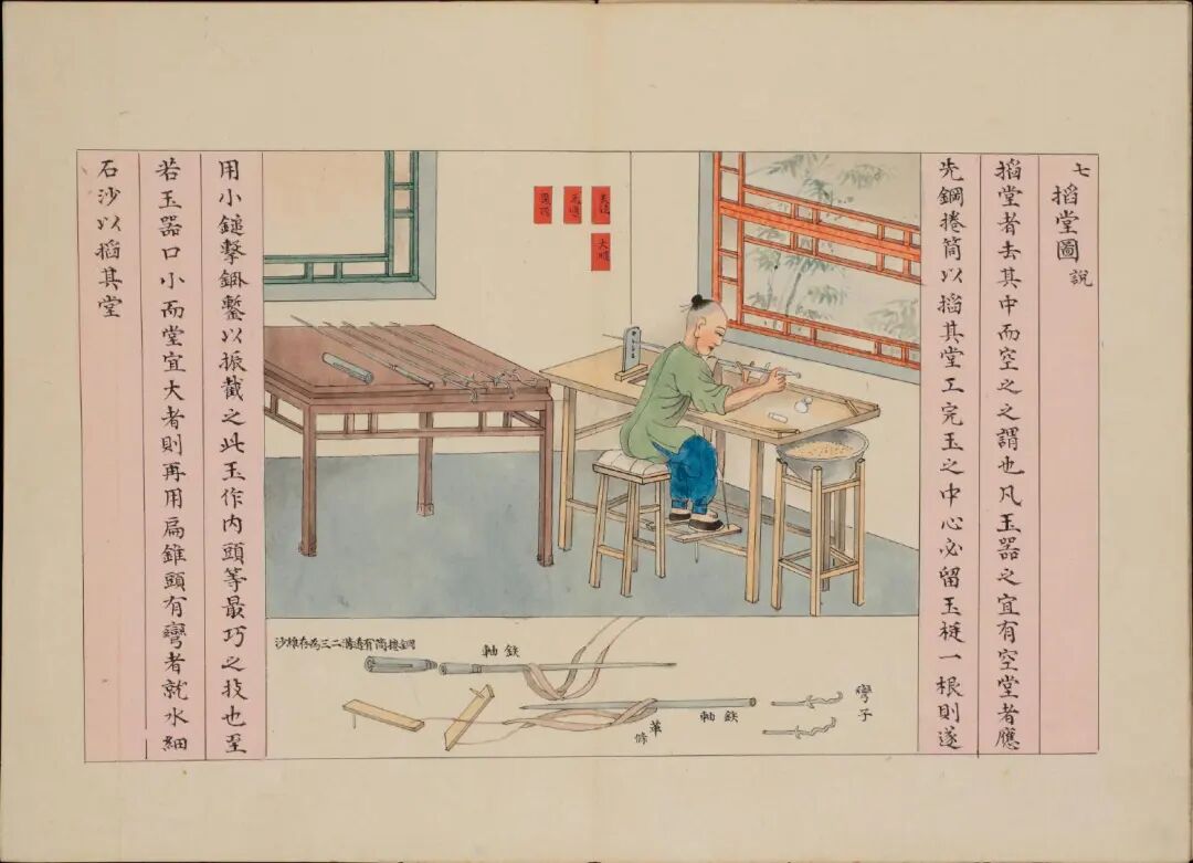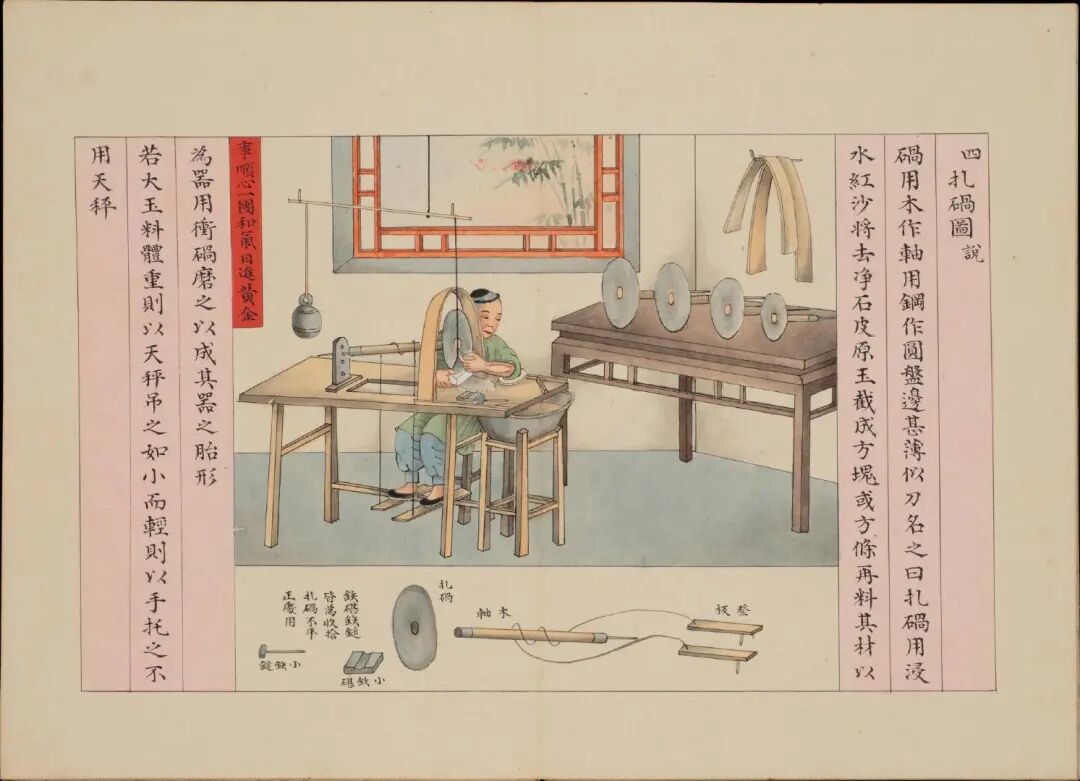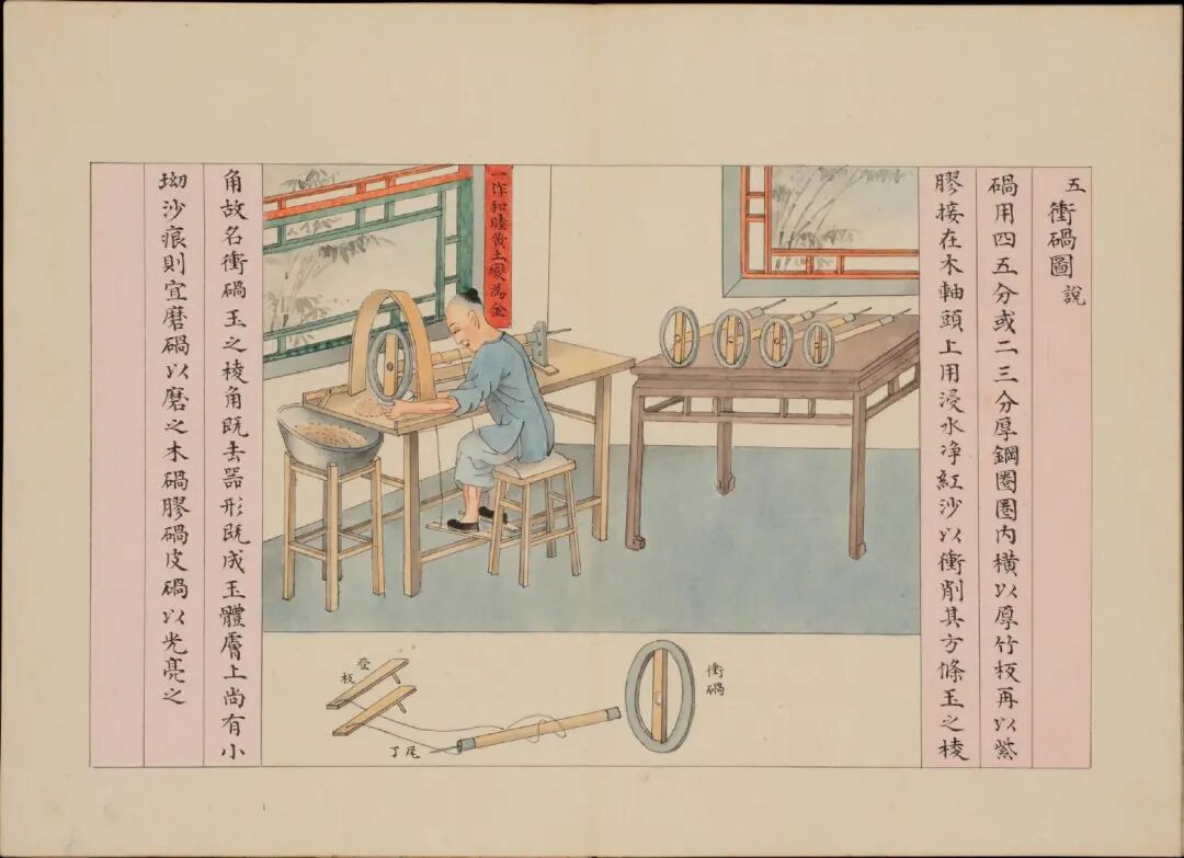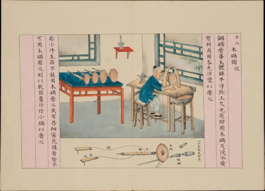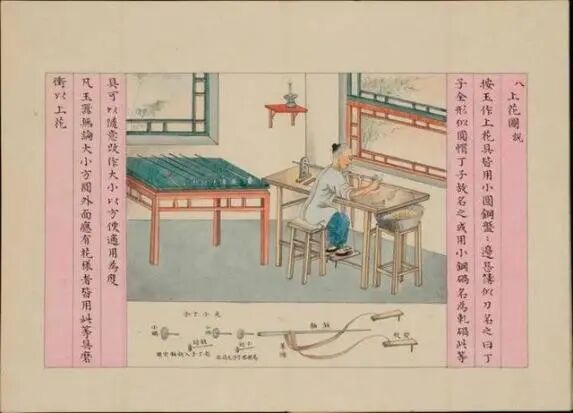 此画册不仅描绘了制玉人劳动操作的场面,还将重要工具名称都一一注明。