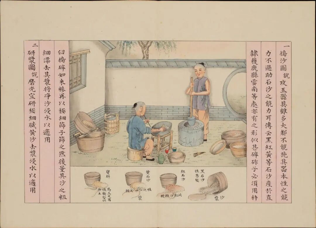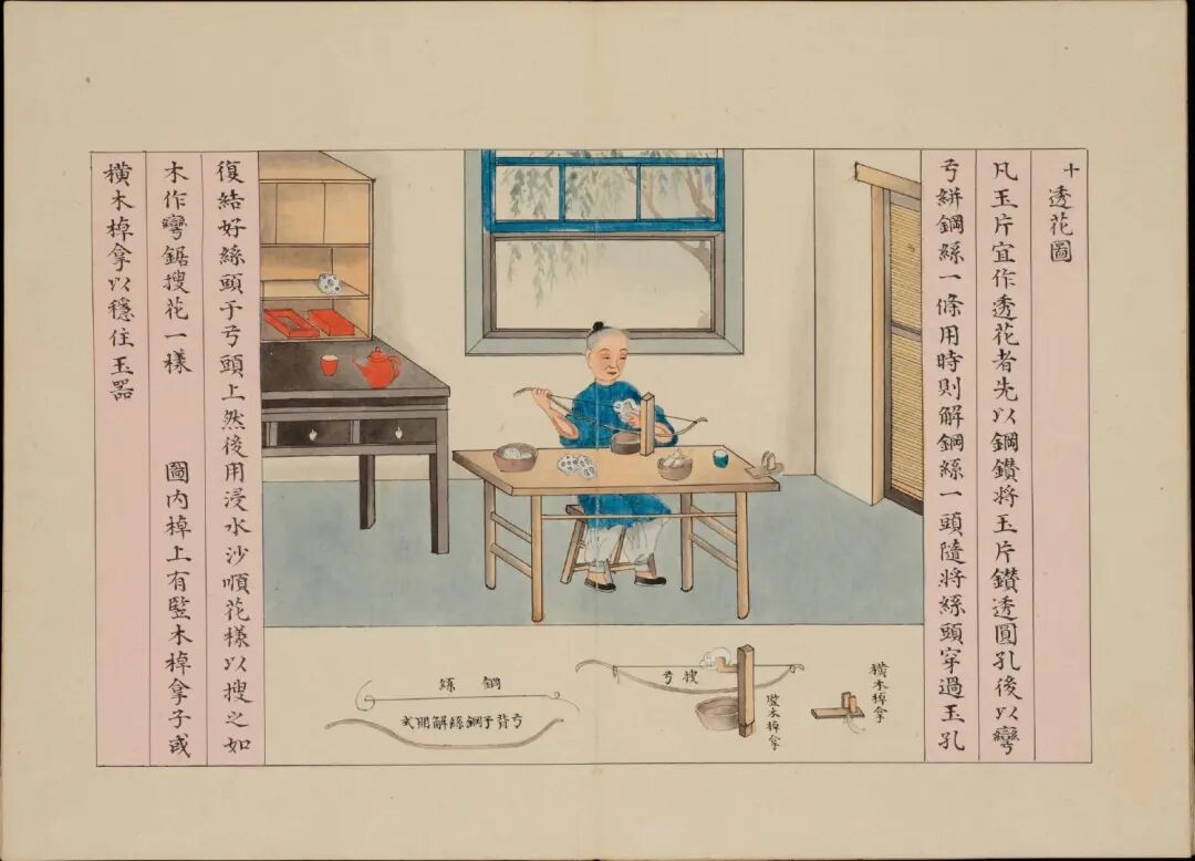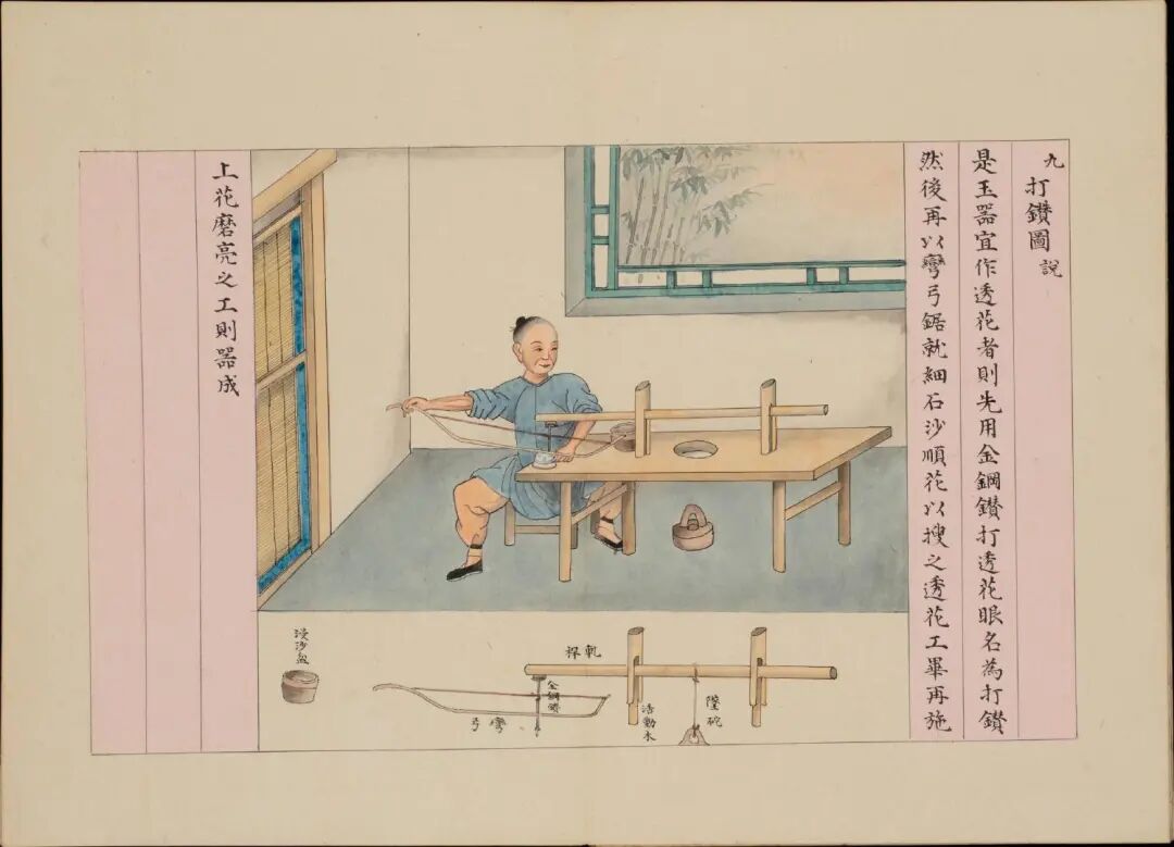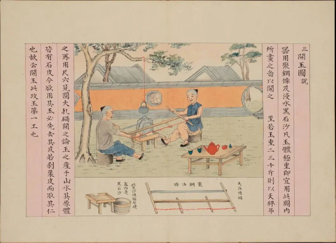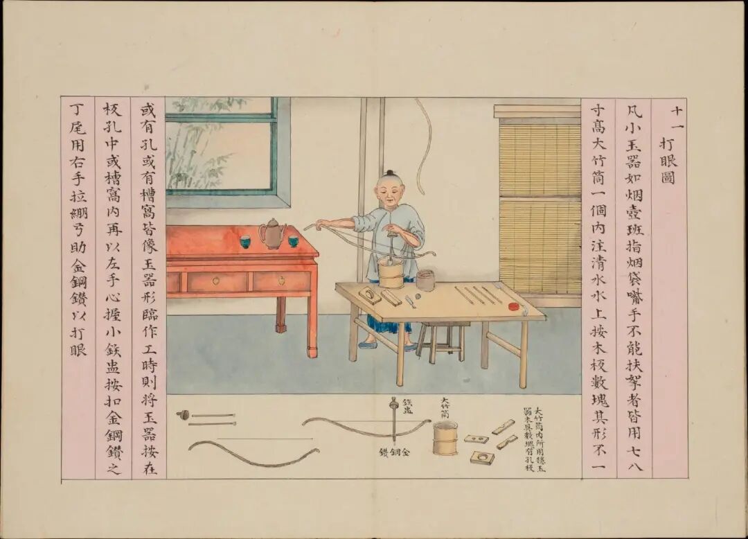 故宫博物院玉器馆藏有清光绪十七年李澄渊所绘的《玉作图》,共12幅。如实记载描画出了古时制玉的主要步骤。每图分上下两部,上部描画出制玉的手法,下部描画出此手法所运用的工具。