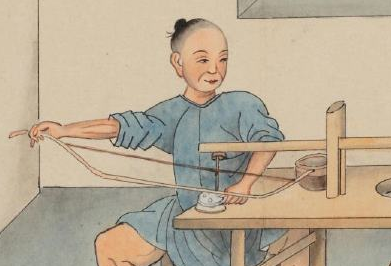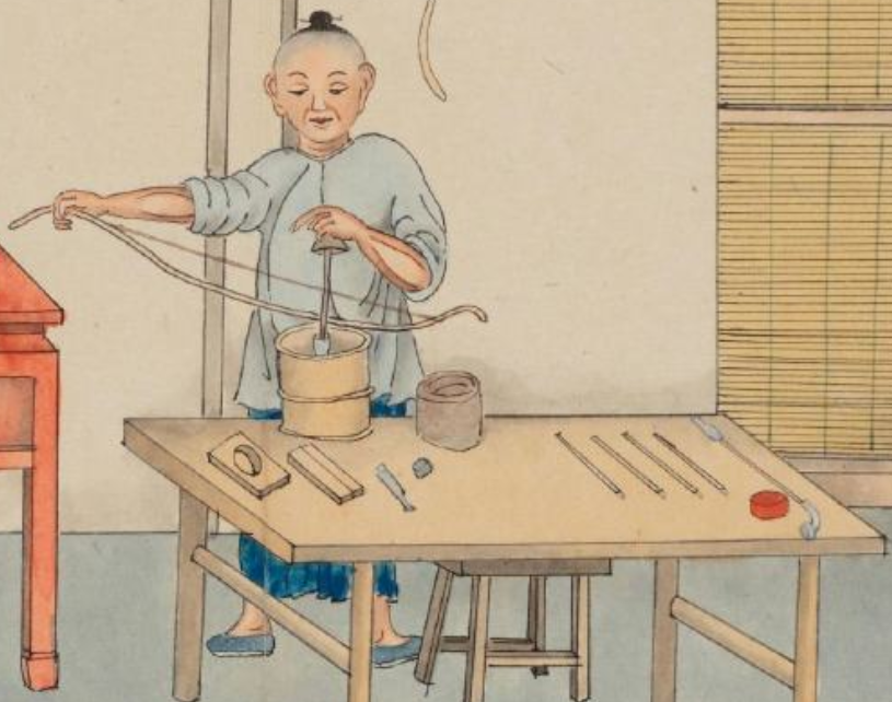 玉工坐在桌子的一端,用左手握着玉器,抵在轧杆下端近金钢钻的下面,右手来回拉动弯弓,弯弓会带动轧杆一来一回旋转,杆尖所嵌的金刚钻就可以把玉钻出一个圆洞了。