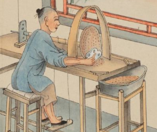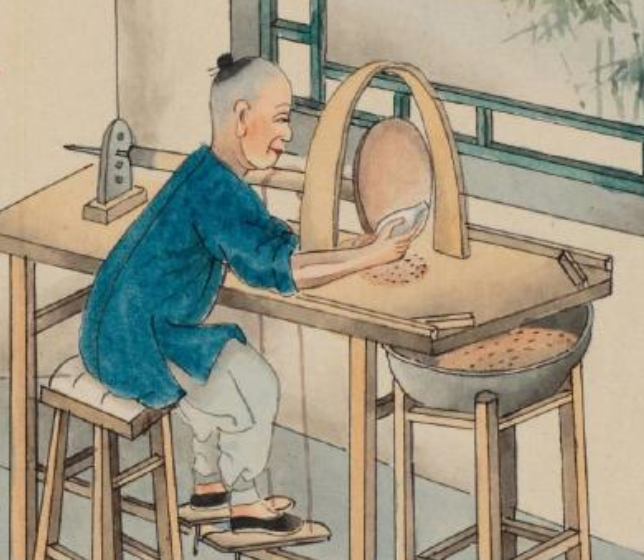 站着的玉工手拿着杵,一下一下地用杵去捣,要把石臼里的石沙敲得更细碎。另一位玉工坐在凳子上,面前放了一个大筛子,筛子的底有细洞,可以让细小的石沙漏下去,粗沙就留在筛子中,这样就可以把石沙按照颗粒大小分类。