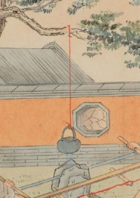 在这张图里,有两个玉工,他们拿着条锯的一端,你来我往地拉着这个条锯。条锯上主要用来切割玉璞的,是一条钢丝。钢丝是割不动玉的,所以在树枝上挂着一个茶壶,壶底有洞,壶里装的黑石沙和水。