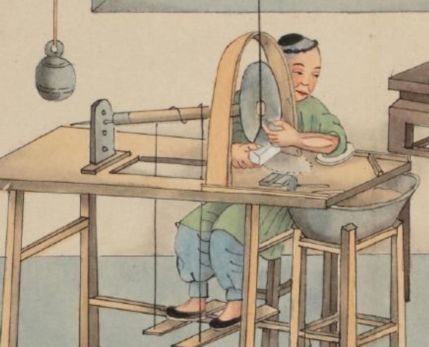 这时使用的工具结构是登板连系着木轴,带动一个圆形的转盘,这步的圆盘,是厚厚的“木碢”,配用的石沙硬度比较低,来细细磨光。