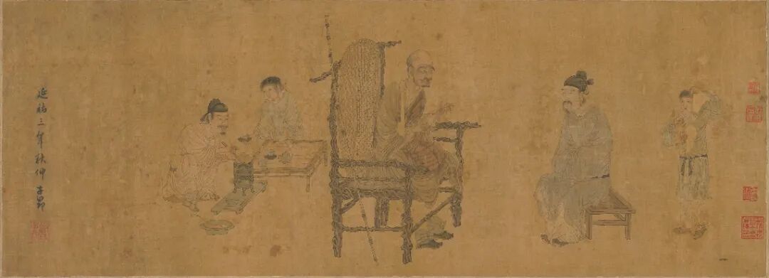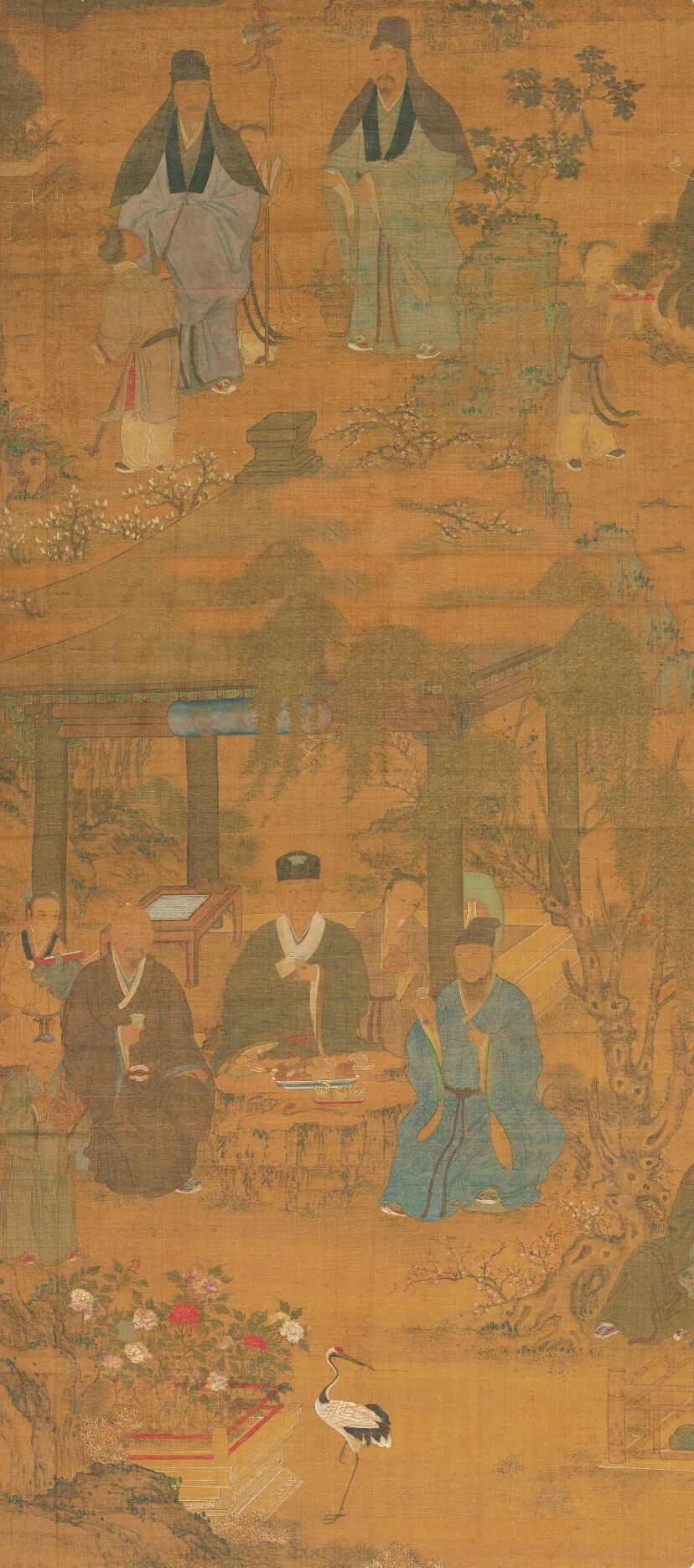此图为明人所绘,作者不详,所绘诸老雅聚于庭院之中,有牡丹、仙鹤、鹿、寿桃、佛手、石榴、葫芦等作衬景,有福、禄、寿等祥瑞之意。此画颇类常见的“香山九老图”。