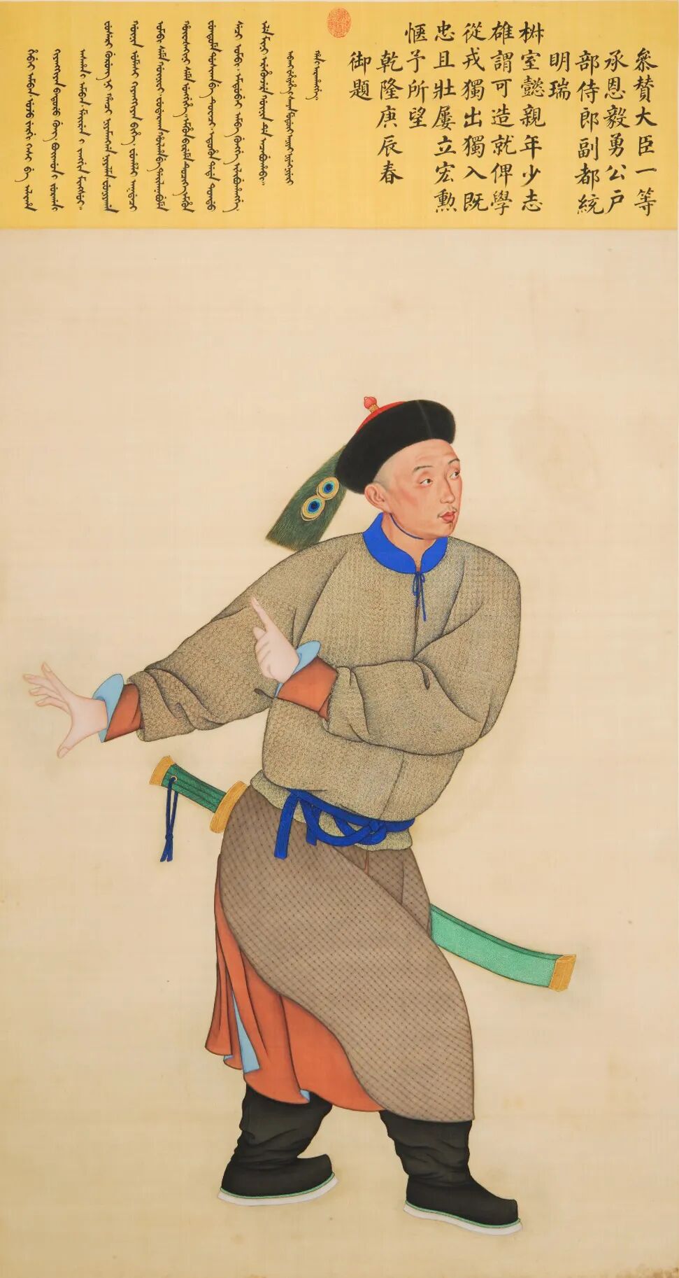 富察明瑞,字筠亭,满洲镶黄旗人,承恩公富文之子,大学士傅恒之侄,清中期名将。因平叛、征缅有功,封一等诚嘉毅勇公。