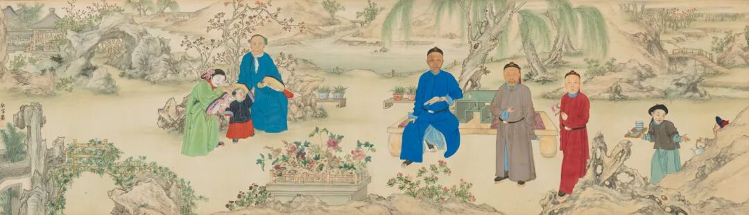 余集(1738—1823),字蓉裳,号秋室,浙江仁和人,清代画家、藏书家。曾授翰林院编修,累官至侍讲学士。余集博学多艺,其诗文书画时称三绝,著有《秋室集》等。图中绘一家四代在山水园林之中欢喜共聚、尽享天伦之乐的场景,卷后有清人翁方纲、董诰、陈嗣龙、汪滋畹等题跋。