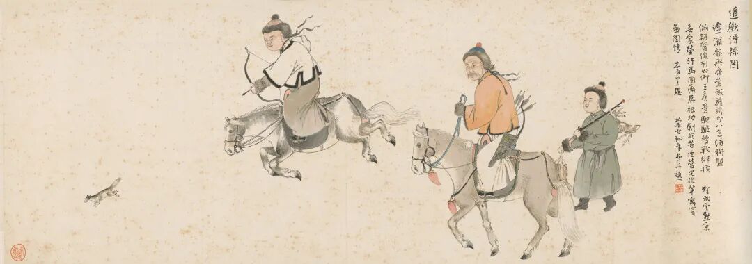 画作描绘猎手们骑马弯弓、追獾得鹿之情形,取其谐音“追欢得禄”。