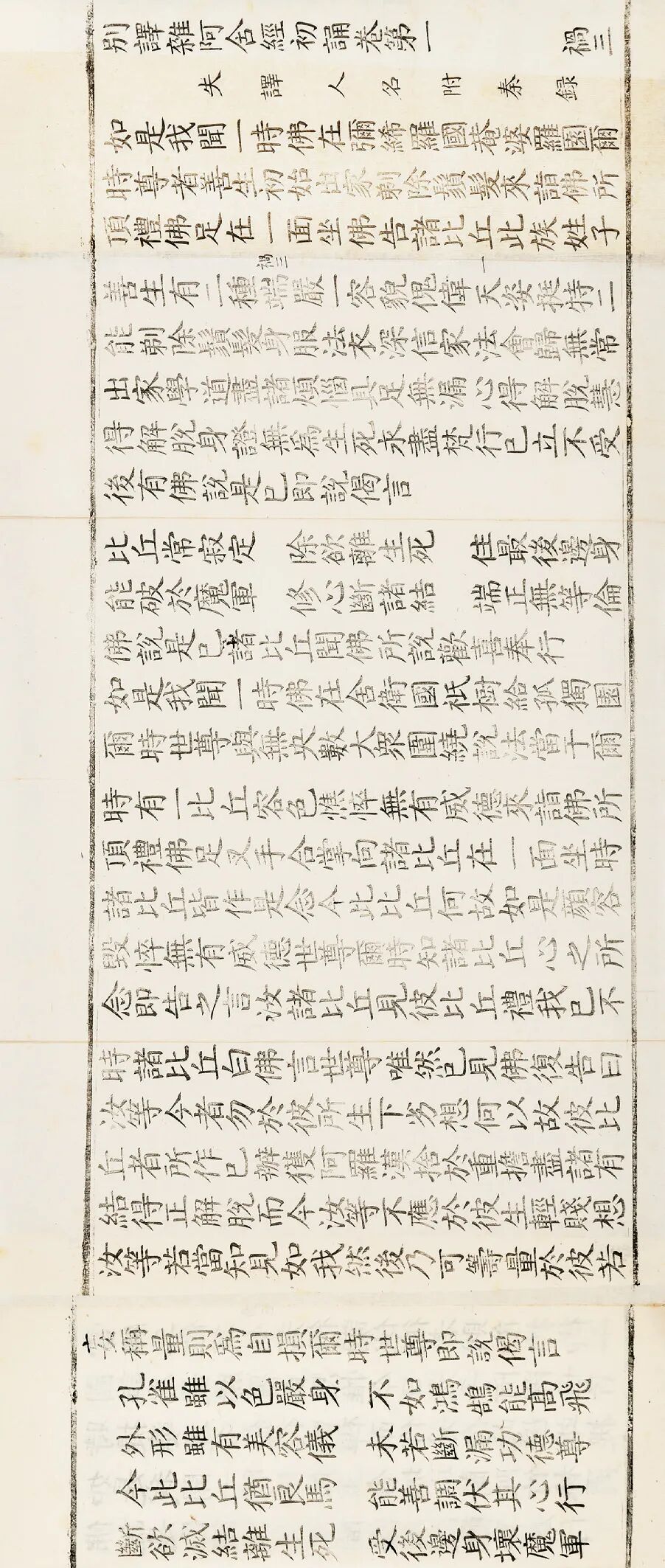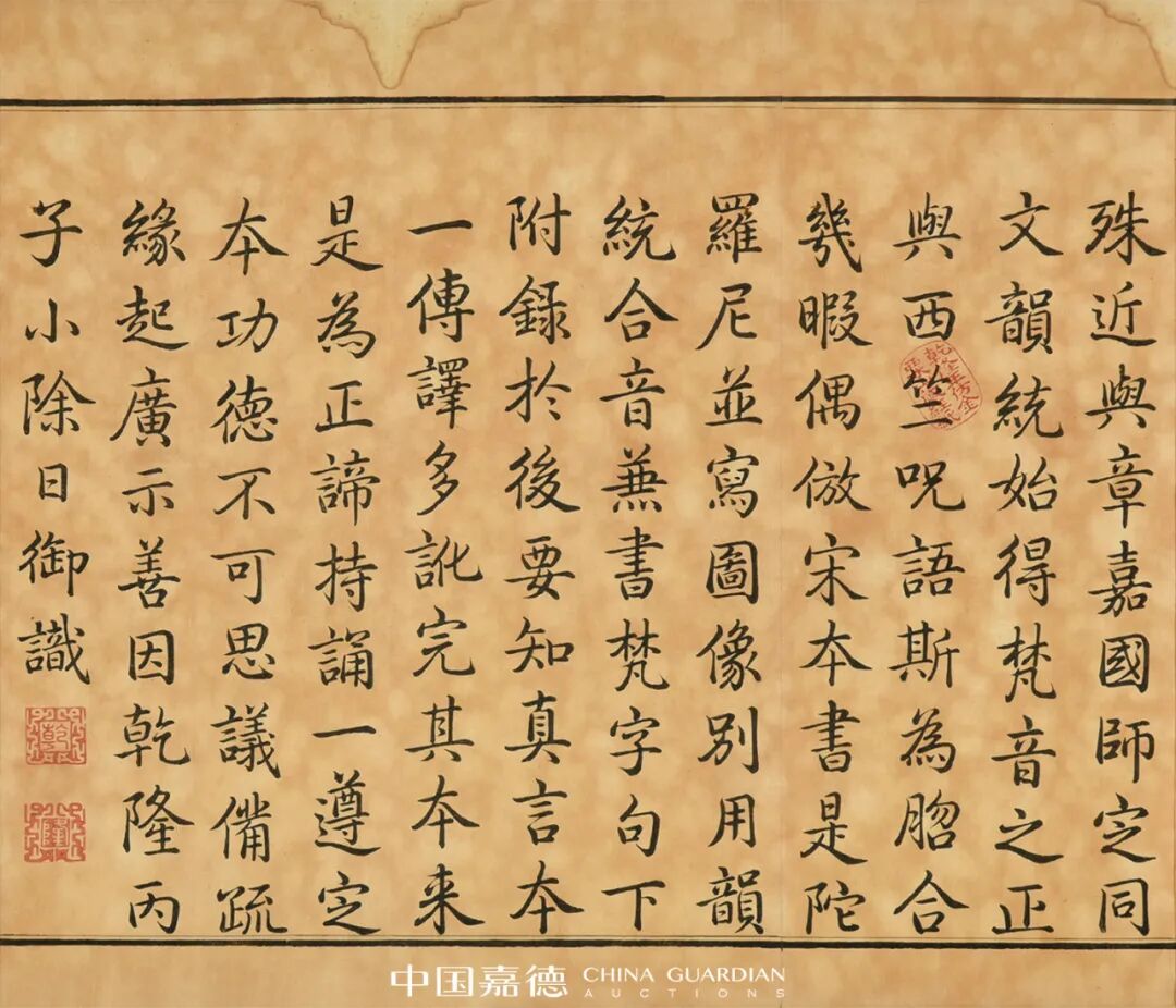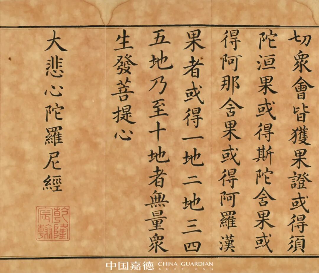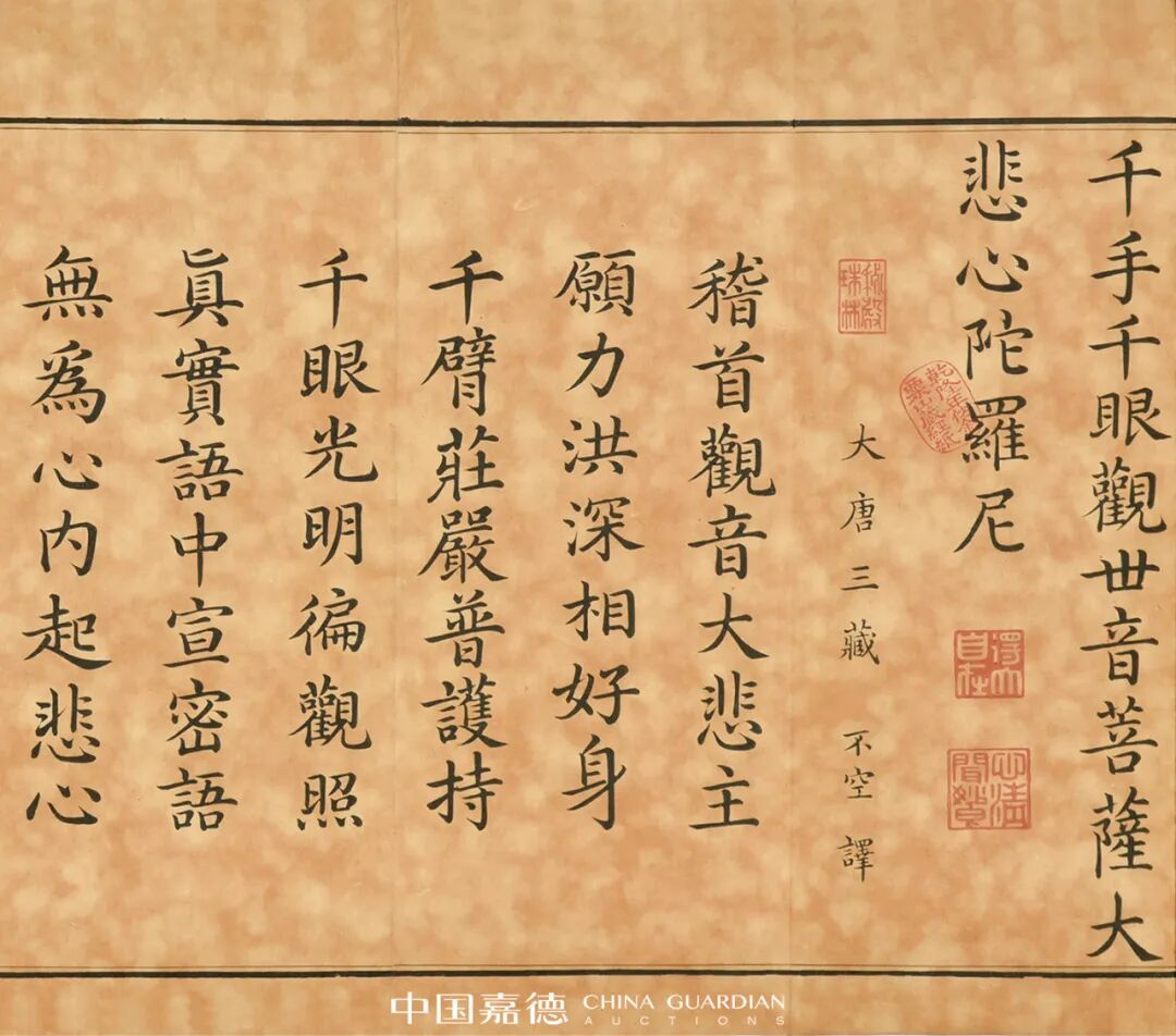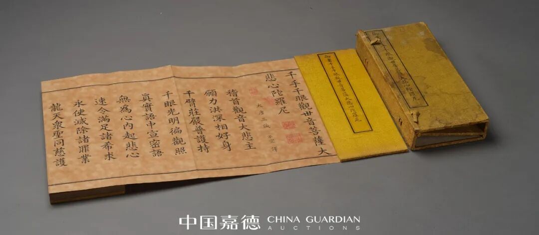 清朝各帝都推崇佛教,有些皇帝还精研佛学,如顺治、康熙、雍正、乾隆诸帝,此次征集所得《千手千眼观世音菩萨大悲心陀罗尼》即据清乾隆帝御书上板,首刊原经,次陀罗尼,内收版画白描佛像四十九尊;末《千手千眼无碍大悲心大陀罗尼神妙章句》,兼附梵字于句下。版刻精细,乾隆仿金粟山藏经纸朱墨套印,是为乾隆发愿督造之内府珍品。
