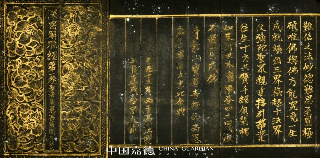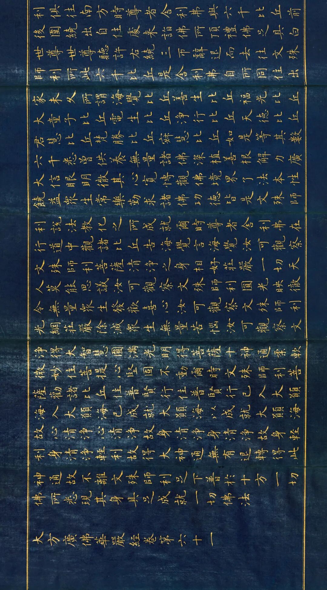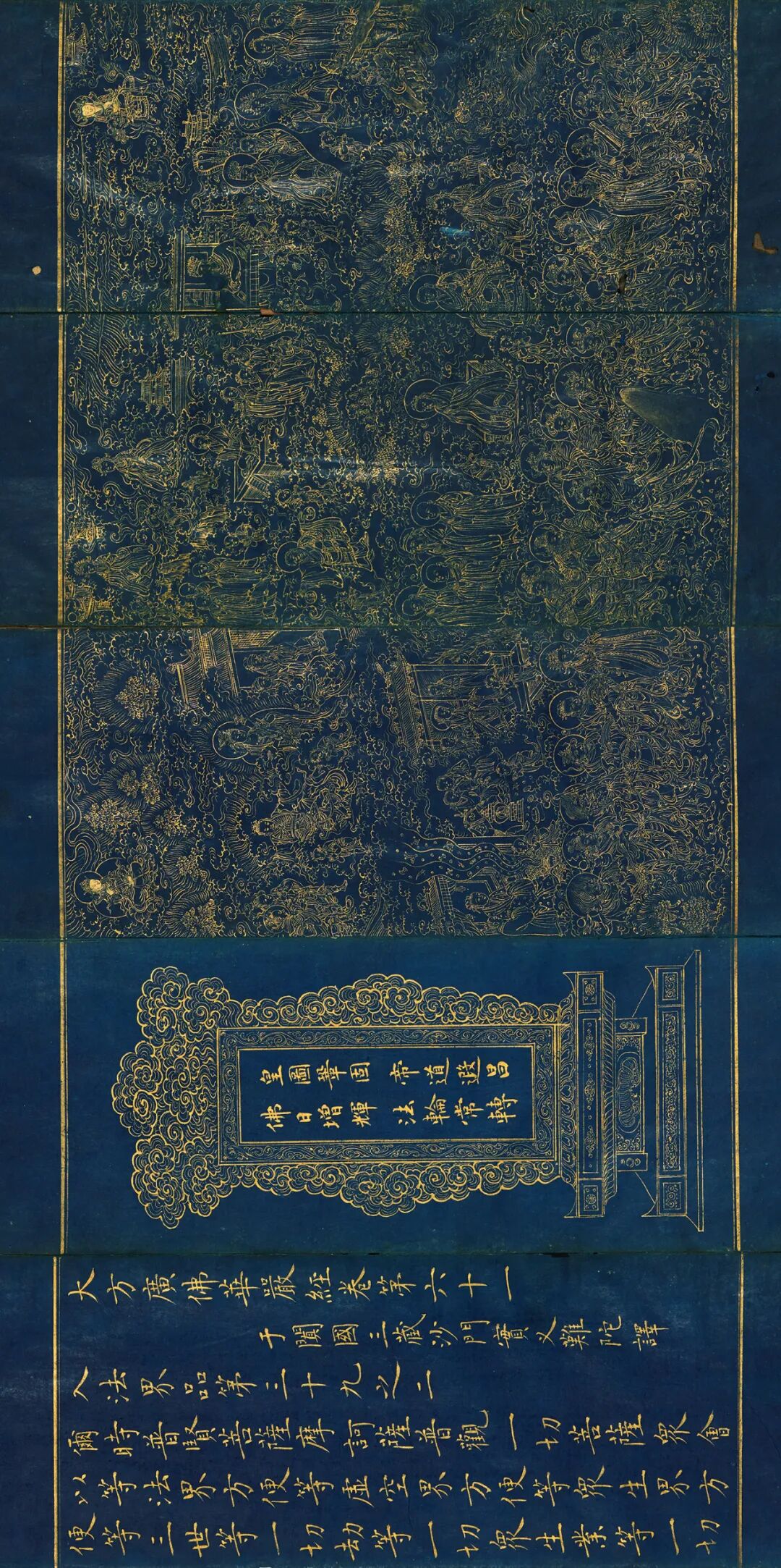 又有明泥金写本《大方广佛华严经》卷第六十一,为绀纸泥金抄本,全卷共五十六折,《大方广佛华严经》卷第六十一首尾俱全。卷首释迦说法图,线条细腻,华丽庄严,牌记书“皇图巩固/帝道遐昌/佛日增辉/法轮常转”,卷首题“大方广佛华严经卷第六十一”,作者题“于阗国三藏沙门实叉难陀译”,内为《入法界品第三十九之二》,末题署“大方广佛华严经卷第六十一”。首尾完整,泥金厚重,笔体舒展,品相完好。
