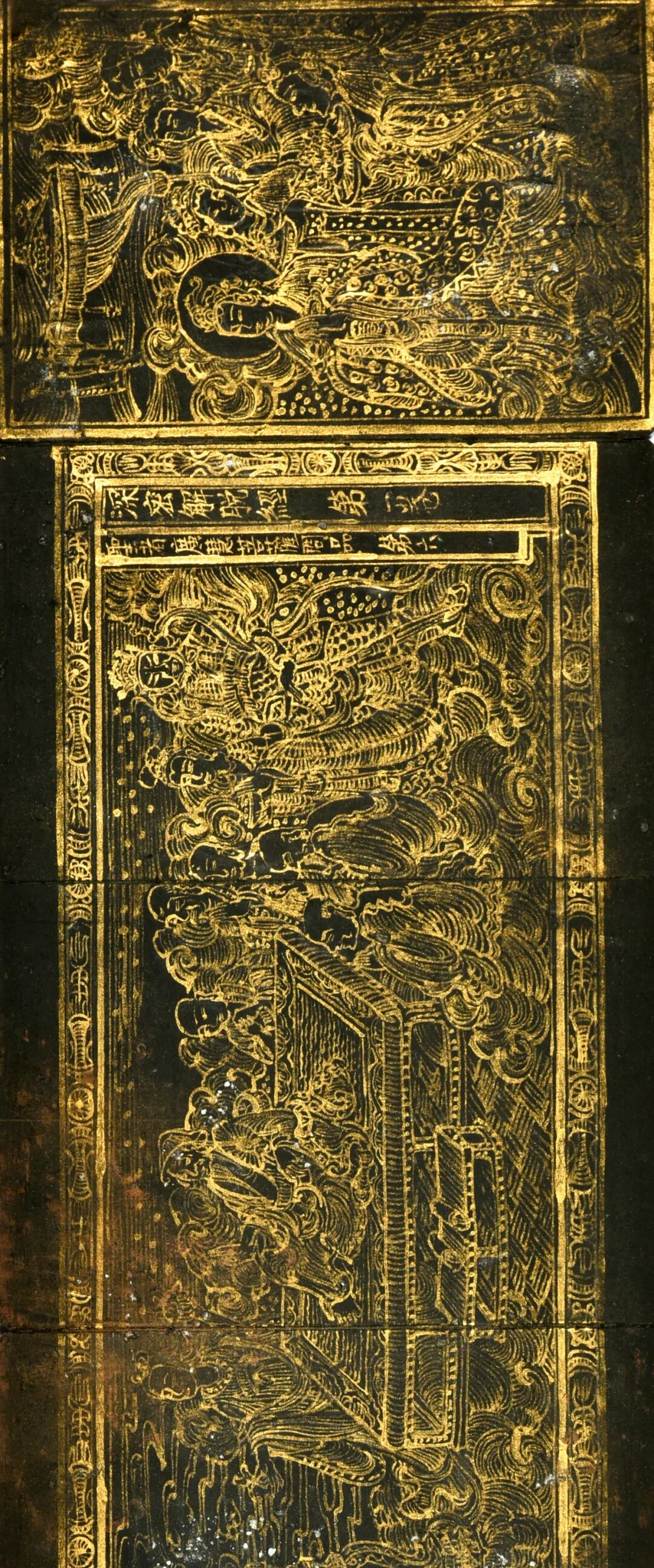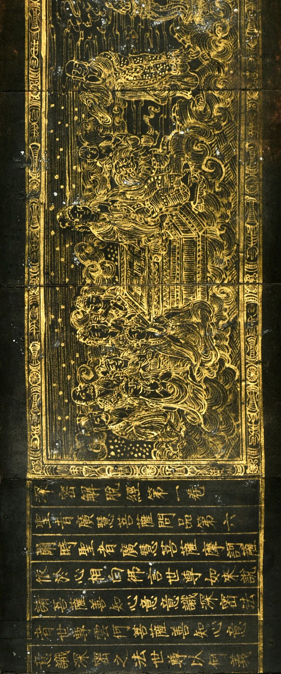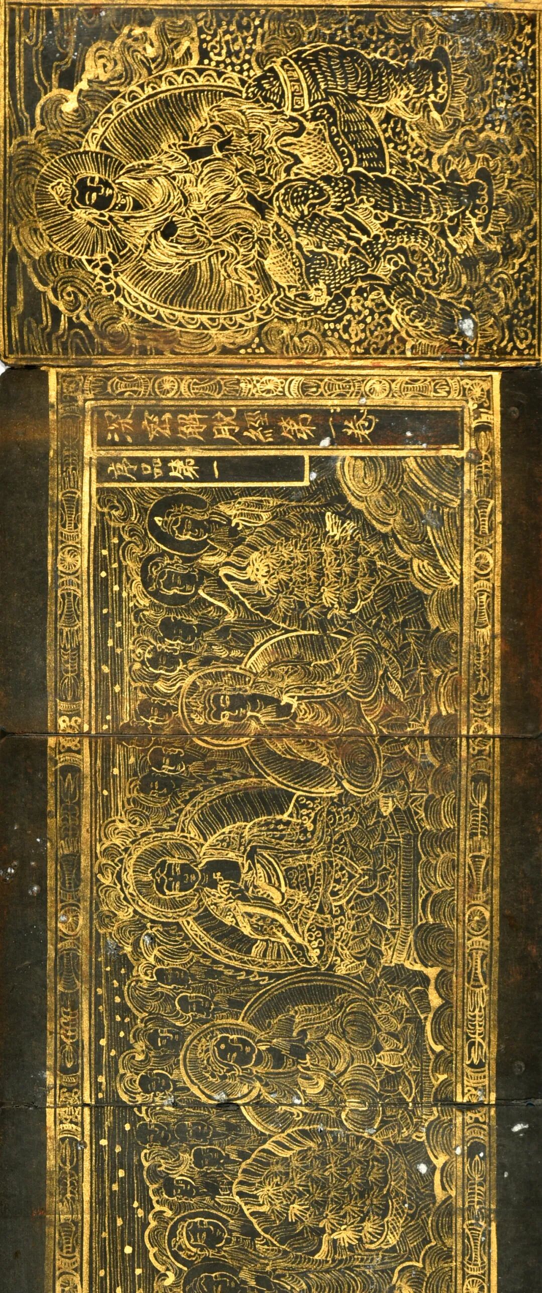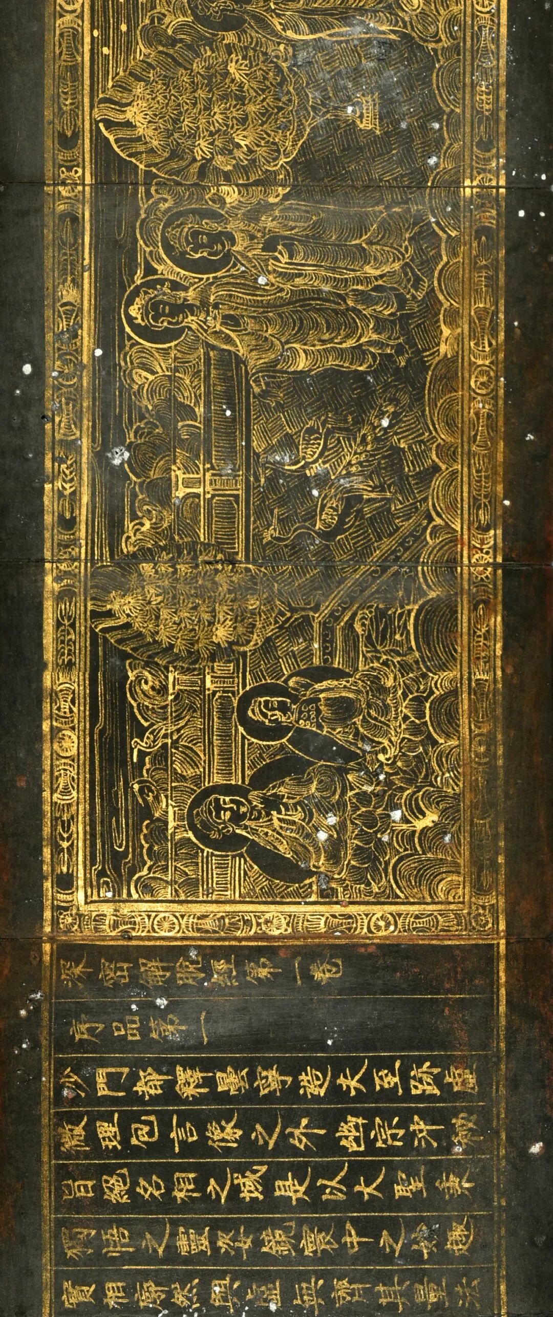 元至元十三年(1276)高丽国王发愿泥金写本《深密解脱经》同样为泥金写本,与中原地区明代泥金写本有异曲同工之妙,又别具特色。全经末署“至元十三年丙子高丽国王发愿成金字大藏”,每册双面书写,卷首末均绘泥金菩萨像,正文前绘释迦说法图。画面布局紧凑,疏密有致,线条繁而不乱,人物衣褶、神情刻画仔细,金泥饱满均匀,显示了高超的绘画技法。首尾俱全,品相完好。