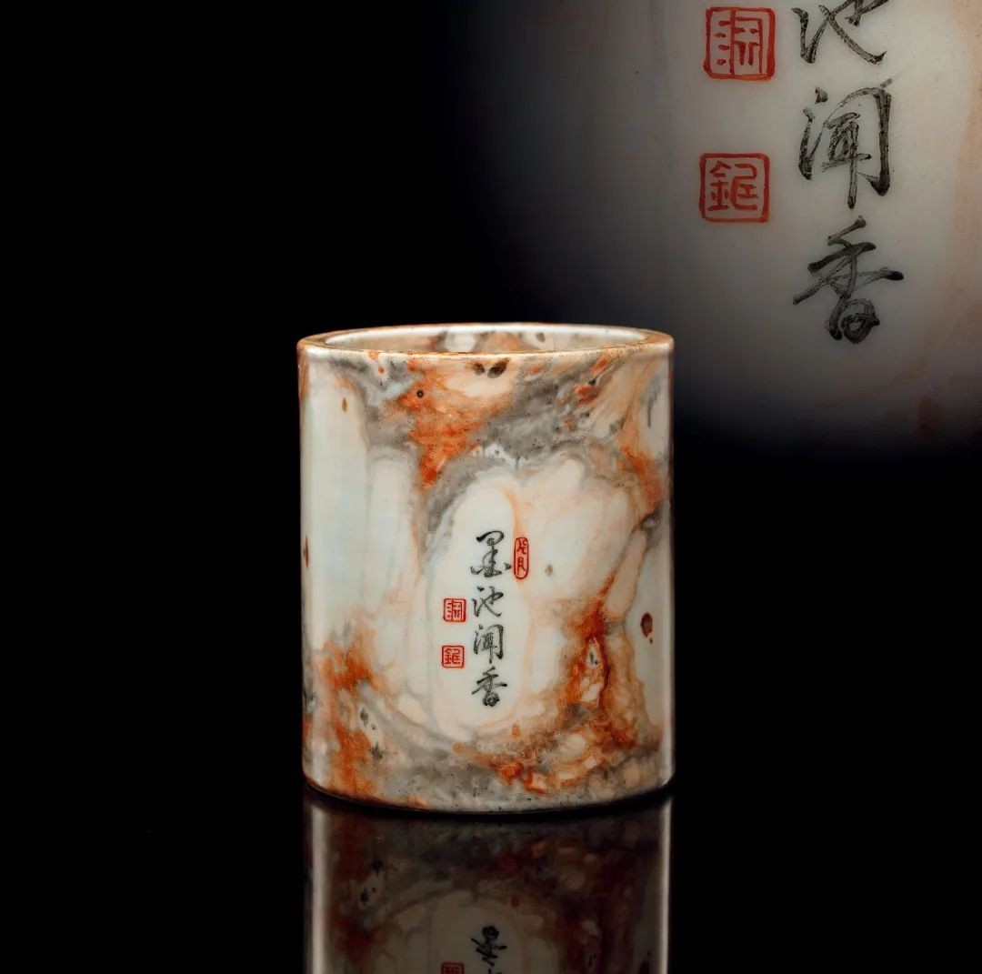 清乾隆 唐英制仿石纹釉墨彩「墨池闻香」笔筒