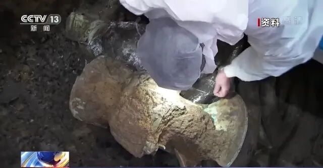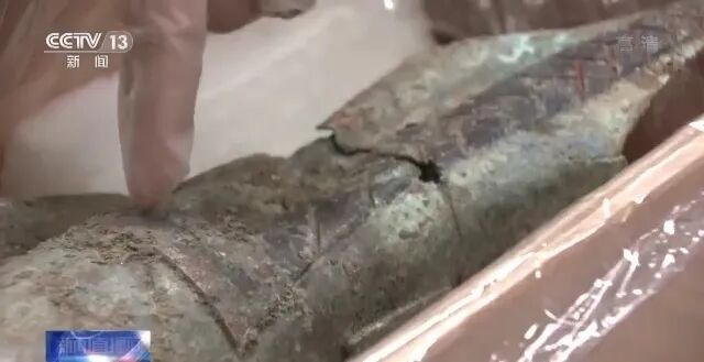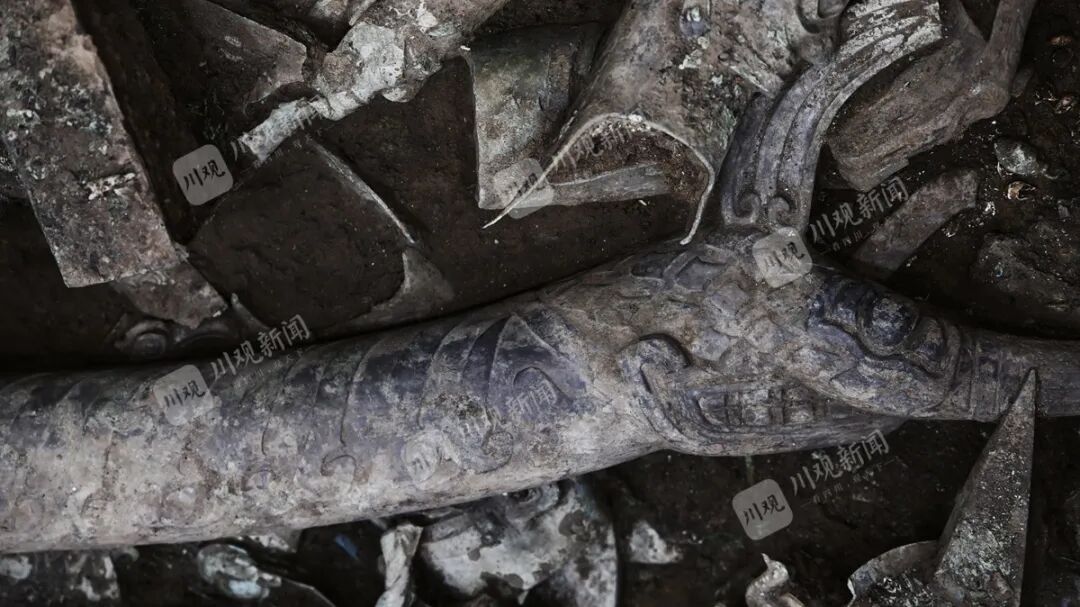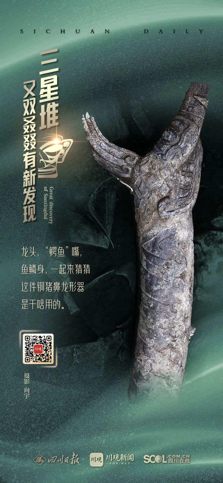 这玩艺儿前几天完全露出来的时候,让考古人员也很头疼,他们也不知道这是啥东西,只能根据形状暂时取名柱状龙形器,后来统一命名为铜猪鼻龙。