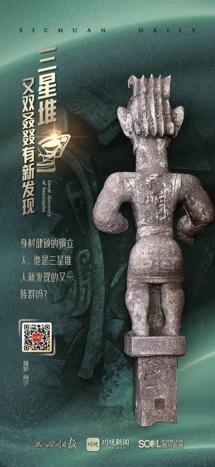 另一件穿裙立发立人像同样属于立发一族。虽然他还趴在坑内,却可见其身材健硕魁梧,服饰也相对简单,全然不同于青铜大立人的清瘦。
