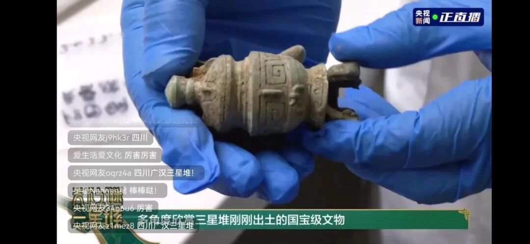专家介绍,黑色彩绘,在近期出土的青铜人头像上也有发现。而这件青铜人头像,是7号坑出土的第一件铜器,它的独特之处,就在于人物发辫就带有黑色彩绘,铸造发辫的凹槽内,则彩绘红色。给青绿色为主基调的人物造像,增添了几分亮色。带有彩绘器物的出土,也给考古专家解码三星堆谜团,提供了新线索、新钥匙。