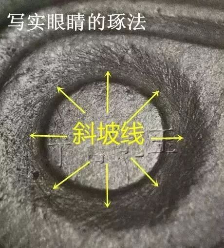 阴刻线的坡线(刀)技法起源于商代中晚期的工艺探索,商代动物眼睛的制作有两大特点,一是写意“臣”字眼,另一就是写实打磨仿生的动物大“圆”眼:先在动物眼部管钻或者刻划一个“圆”作为眼睛定位,然后在圆圈外侧磨去多余玉料,形成斜边线突出眼睛的效果,最初的“大斜线”产生了(图2),最初的大斜线是磨出来的。