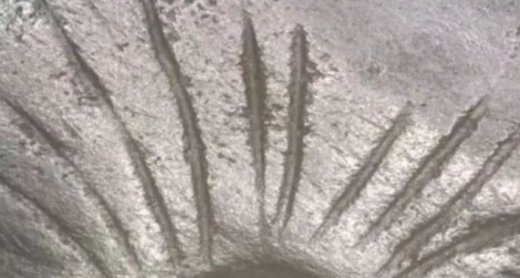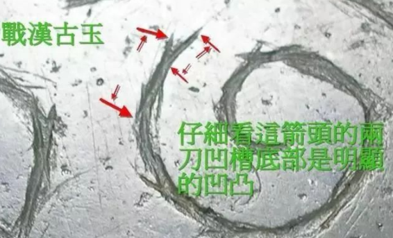 徒手抓握磨石等工具刮蹭产生的视觉效果,可以看到,线条周边毛糙,未经后期打磨修饰,沟底也表现出粗糙之感,这种常见于葬玉,一般来说器物不够精美.