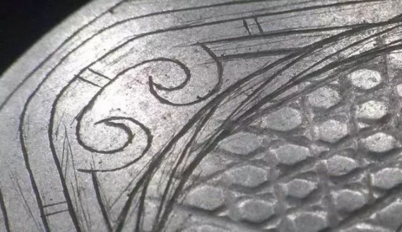 阴刻线转弯处砣工犀利、流畅,能看到解玉砂的划痕,呈现磨砂状。没有明显的底子凹凸不平,这与砣具的快速运动有关,属于半自动化,超越了纯手工刻划的效率。