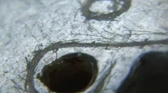 仿品刻划痕,使用高速旋转的金刚砂,快速削磨,沟底干涩生硬,沟边易产生崩口,与真品的转弯处手工刻划痕迹完全不同。