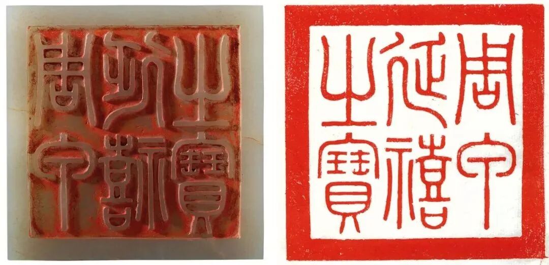 宝玺在现藏北京故宫的《嘉庆宝薮》(嘉庆御玺印谱)中有明确著录,经与实物比对,无论是体量大小,还是篆法布局都与该书中的记载完全相合。「周甲延禧之宝」及其组玺是嘉庆皇帝一生最后制作的几方宝玺之一。