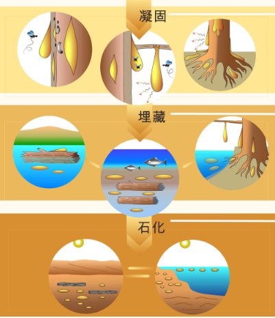 埋藏:处于凝固阶段的树脂有的从树体脱落或随树体一同埋入地表变温层;有的进入河流,再经过河流的搬运,汇聚至缓流的低洼处或三角洲,汇聚后树脂被淤泥逐渐掩盖,进入地表变温层。