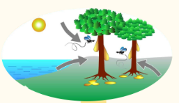 图:树脂离开植物体进入岩石圈石化形成琥珀的过程。