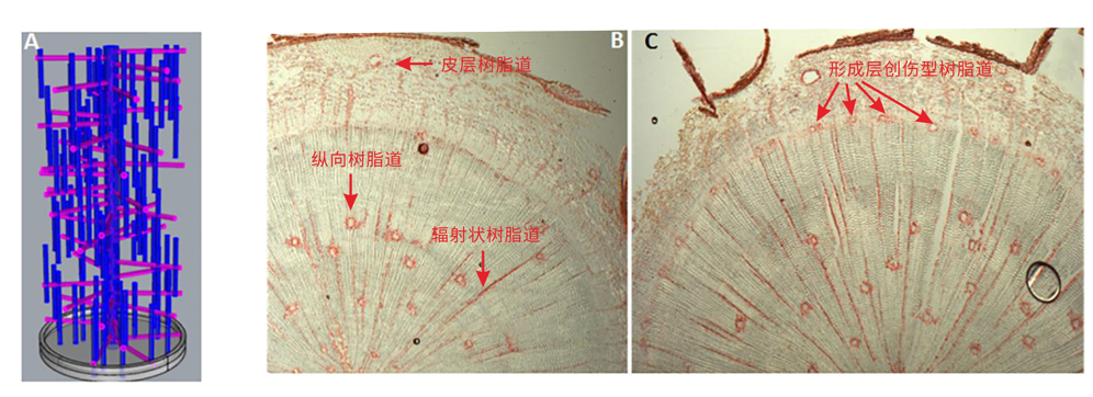 C为经过有诱导植物防御效果的茉莉酸甲酯处理后,在形成层出现了新的树脂道