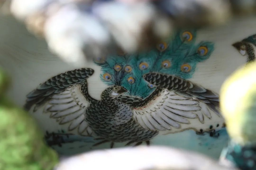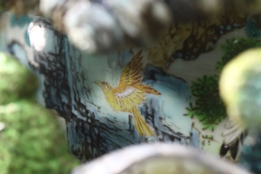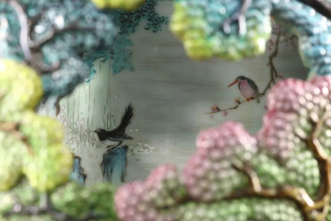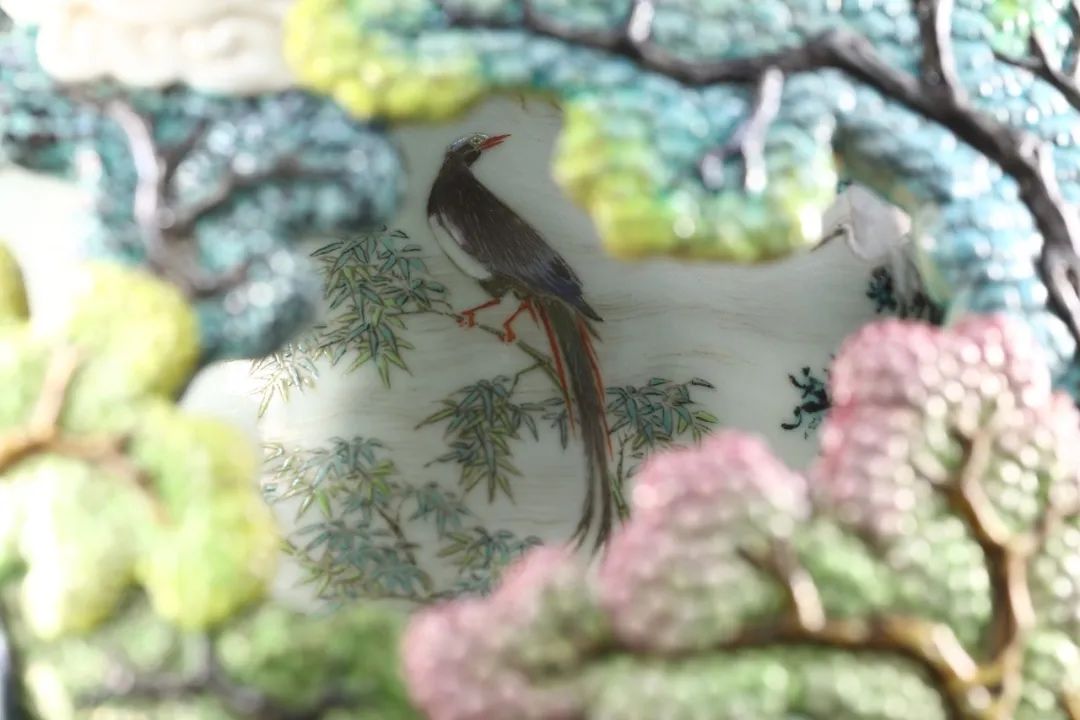 更令人叹为观止的是【清乾隆御制洋彩胭脂红地轧道雕瓷镂空有凤来仪百鸟朝凤图双螭耳大转心瓶】,此转心瓶由上下内外四部分组成,分别为颈瓶、腹瓶、底瓶、内胆瓶,外壁颈瓶、底瓶以胭脂红地轧道洋彩绘制纹饰,两侧贴塑魑龙耳。腹瓶外壁精雕祥云山林之景,一五彩凤凰飞于云端,主题为“有凤来仪”;从瓶身镂空观内胆旋转,各式瑞鸟纷繁,有“百鸟朝凤”之意,弥漫花香鸟语。此瓶汇金彩、松石绿釉、胭脂红料彩、蓝料彩于一身,集轧道、雕瓷、镂空、转心等多种工艺,画面繁复而不杂乱,处处透露皇室威仪,巧夺天工,美艳之极。