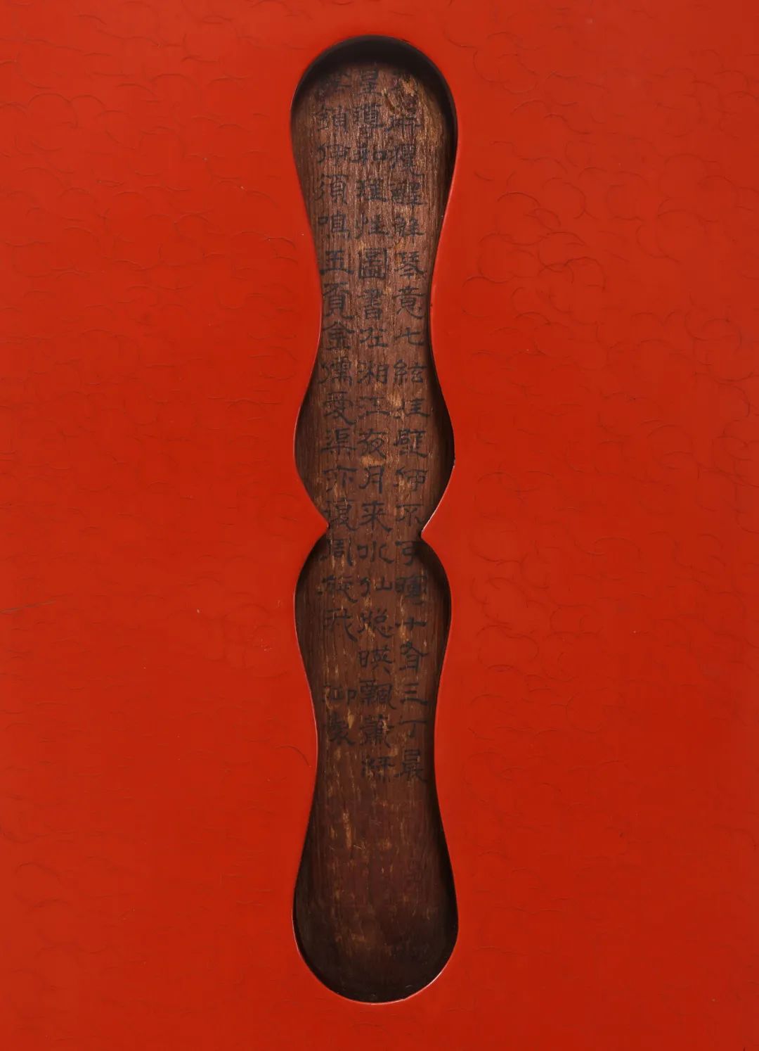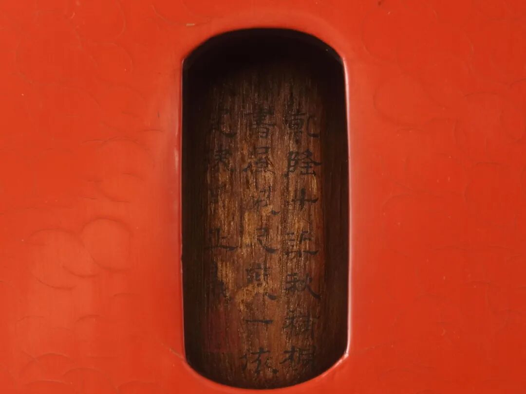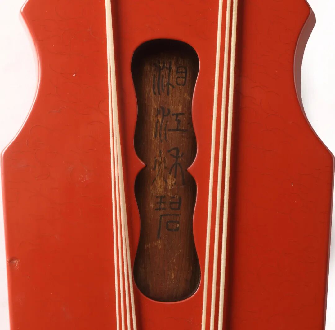 【清乾隆御制“湘江秋碧”琴】通体作梅花断,琴边发连体小蛇腹断纹,精妙难言。琴面岳山至七徽处绘有祥云闲鹤。琴轸、雁足等刻有鹤舞祥云纹,填以金漆。琴面朱漆润泽明亮,如珊瑚色。琴底龙池、凤沼等为如意椭圆形设计,更于龙池、雁足间开二寸许椭圆音孔,此为一般琴制所无。钤“乾隆御笔”朱印;龙池、雁足间二寸许椭圆音孔纳音处墨书铭:“乾隆十年秋补桐书屋製,尺度一依钦定律吕正义”。钤“比德”朱印;凤沼纳音处篆文墨书琴名:“湘江秋碧”,钤“御赏朱印”。