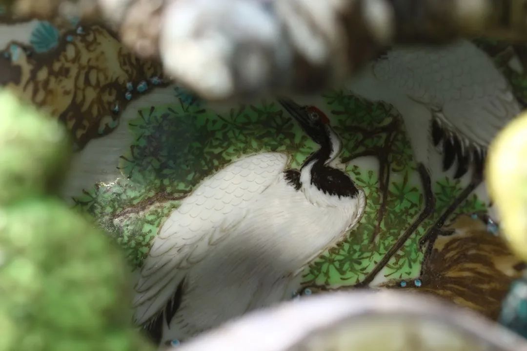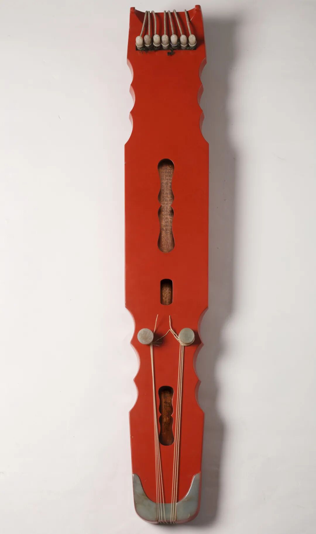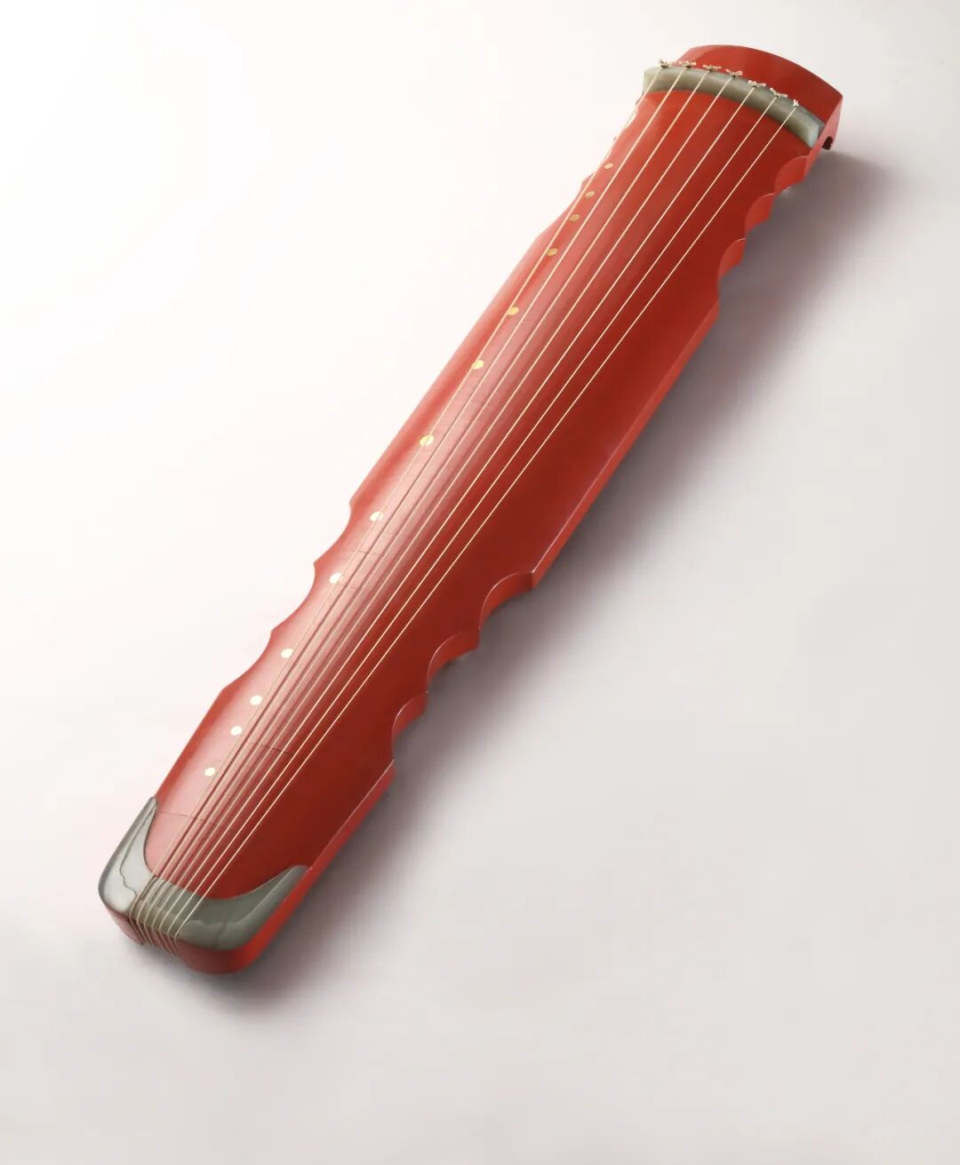 【清乾隆御制“湘江秋碧”琴】通体作梅花断,琴边发连体小蛇腹断纹,精妙难言。琴面岳山至七徽处绘有祥云闲鹤。琴轸、雁足等刻有鹤舞祥云纹,填以金漆。琴面朱漆润泽明亮,如珊瑚色。琴底龙池、凤沼等为如意椭圆形设计,更于龙池、雁足间开二寸许椭圆音孔,此为一般琴制所无。钤“乾隆御笔”朱印;龙池、雁足间二寸许椭圆音孔纳音处墨书铭:“乾隆十年秋补桐书屋製,尺度一依钦定律吕正义”。钤“比德”朱印;凤沼纳音处篆文墨书琴名:“湘江秋碧”,钤“御赏朱印”。