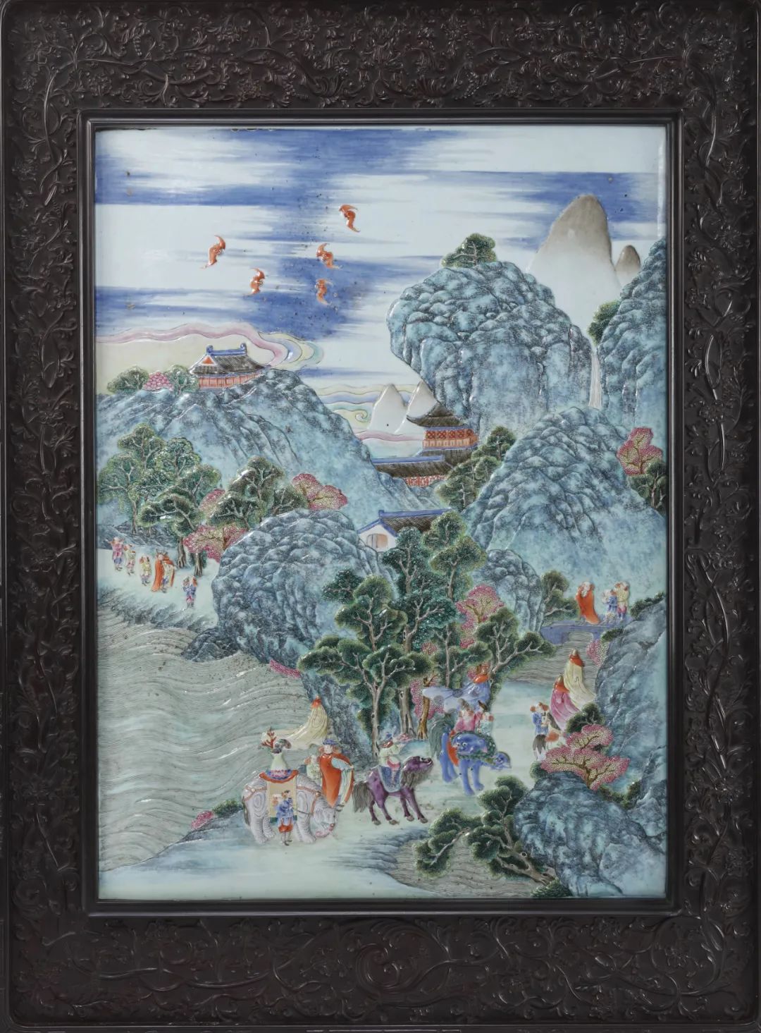 清乾隆洋彩雕瓷‘八蛮进宝’山高水长大瓷板挂屏