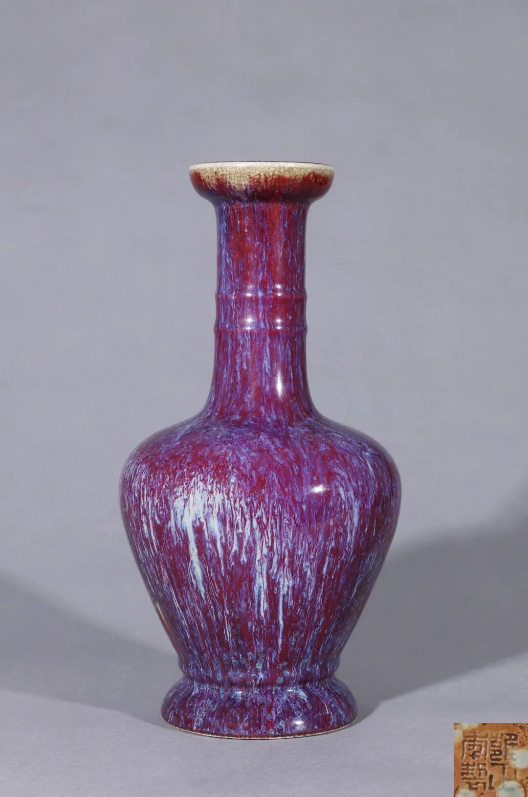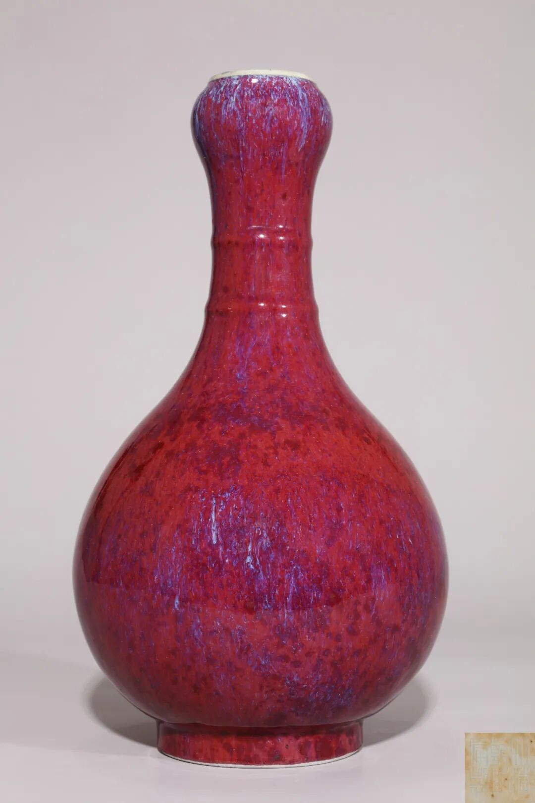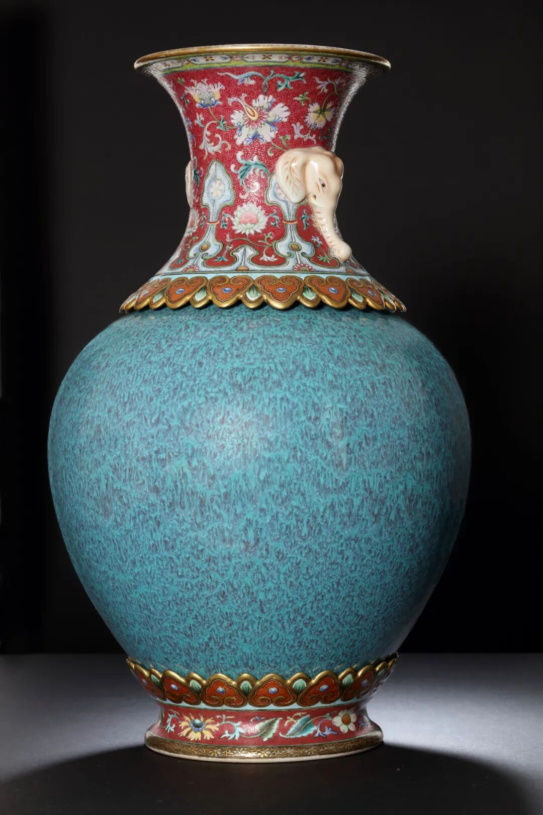 雍正十三年(1735)唐英著《陶成纪事》所载五十七种釉色,并呈“岁例供御”,逐成一朝颜色釉之美。本次大展中的明星展品【清乾隆御制洋彩胭脂紫地番莲花卉套炉钧釉双象耳转心瓶】为例,它是同时期御窑瓷品中的珍罕之作。转心瓶的每一用色及纹饰精工至极,独具西洋韵味的缠枝花卉,胭脂红釉色为底的颈部,两侧收紧处饰有造型灵动的双象耳,象首的肤纹褶皱刻画极为细腻,寓意“太平有象”之美好,为乾隆八年至十年之间所特制。