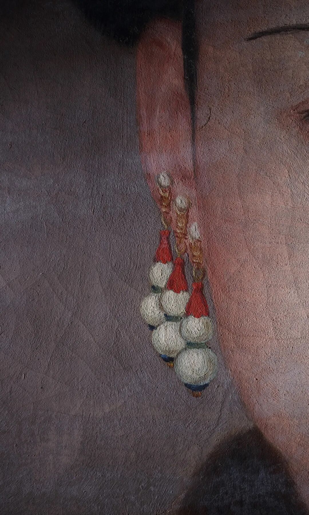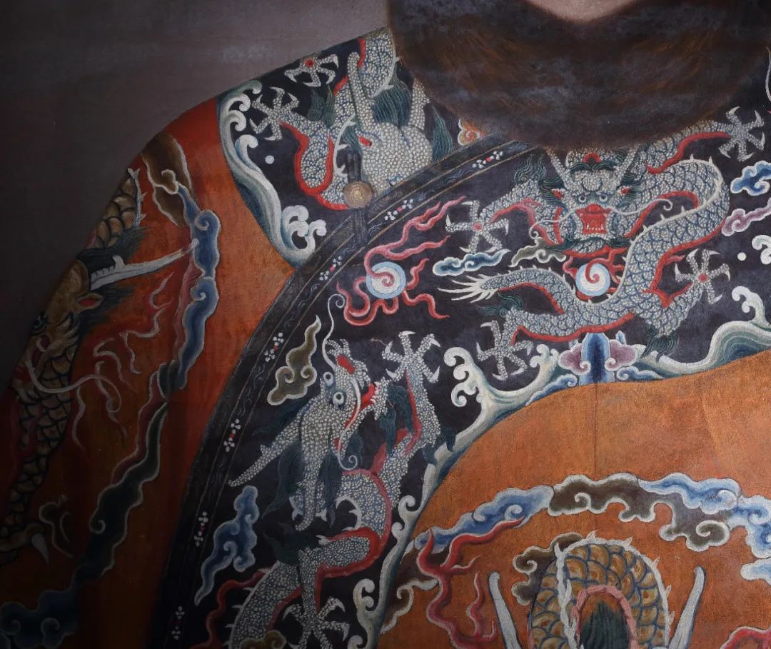 按《大清会典》中记载,金黄色为妃及贵妃所专用。耳饰为一耳三钳东珠耳坠,画面四周贴明黄色织金缎细边。画中的服冠,体现了清代宫廷服饰制度的严苛,其绣工、用料以及织造都极为华美精致。