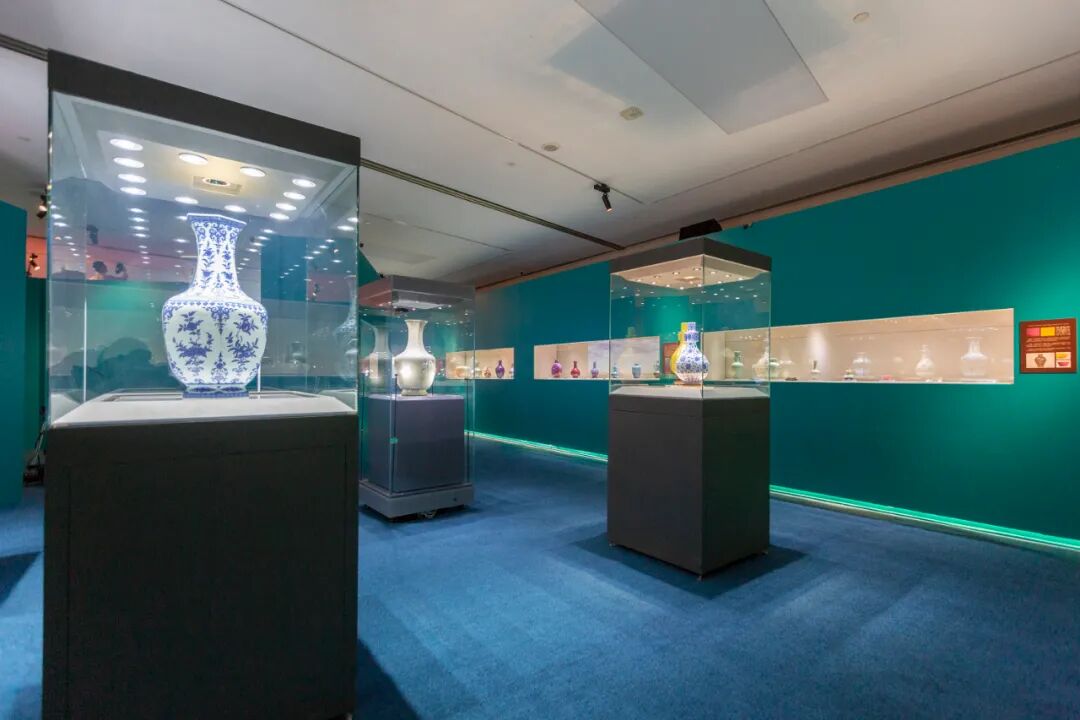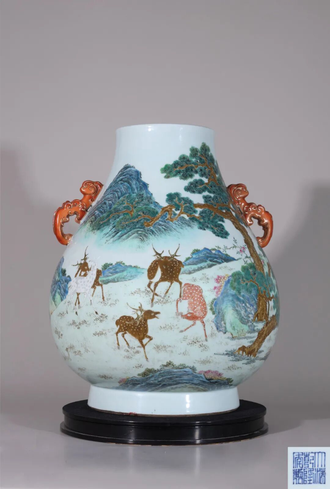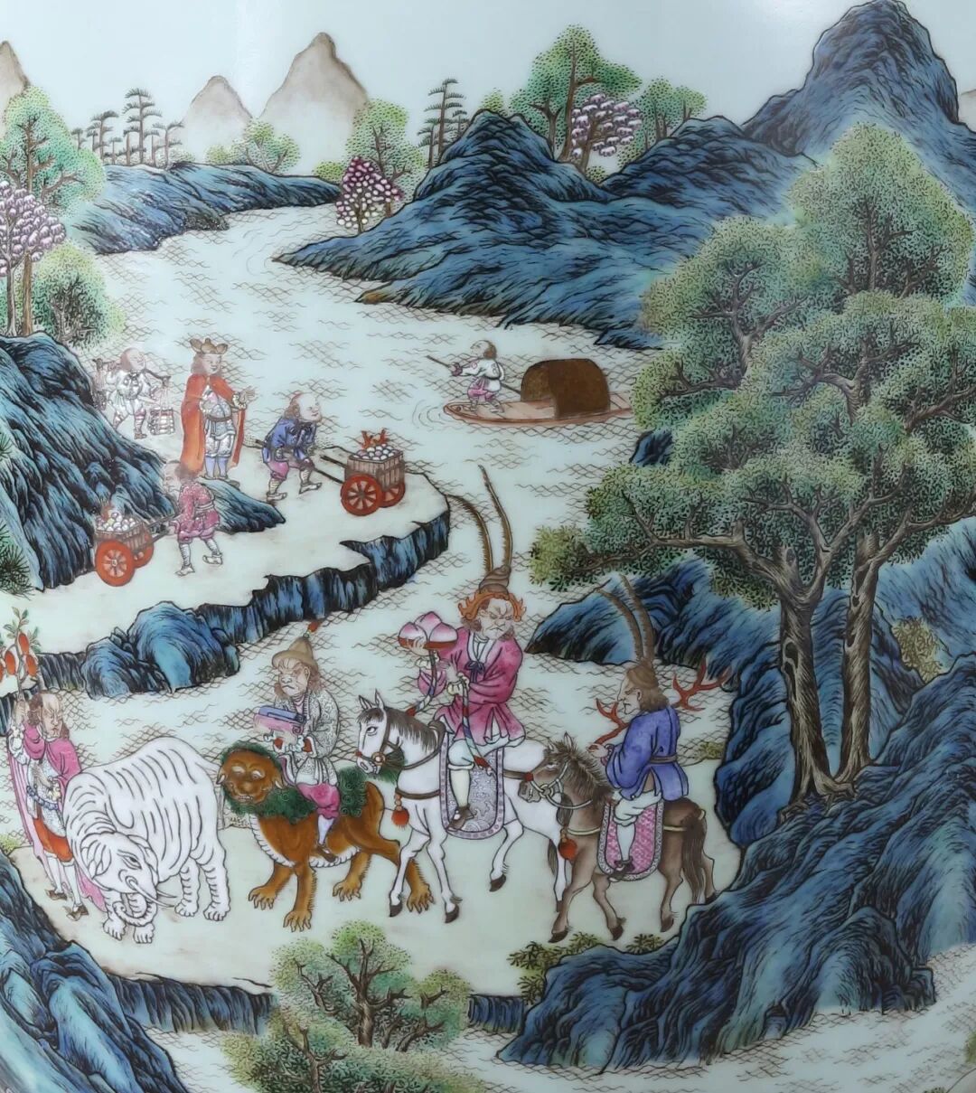展览中还有【清乾隆洋彩‘八蛮进宝’双耳大瓶】、【清乾隆洋彩雕瓷‘八蛮进宝’山高水长大瓷板挂屏】,八蛮进宝即反映各方来朝,乾隆盛世的太平景象。八蛮进宝的队伍行于崎岖的山道上,各酋首分别骑于宝马、瑞兽之上,头戴稚鸡翎冠帽,诸随从手持或肩挑贡物,极为形象。