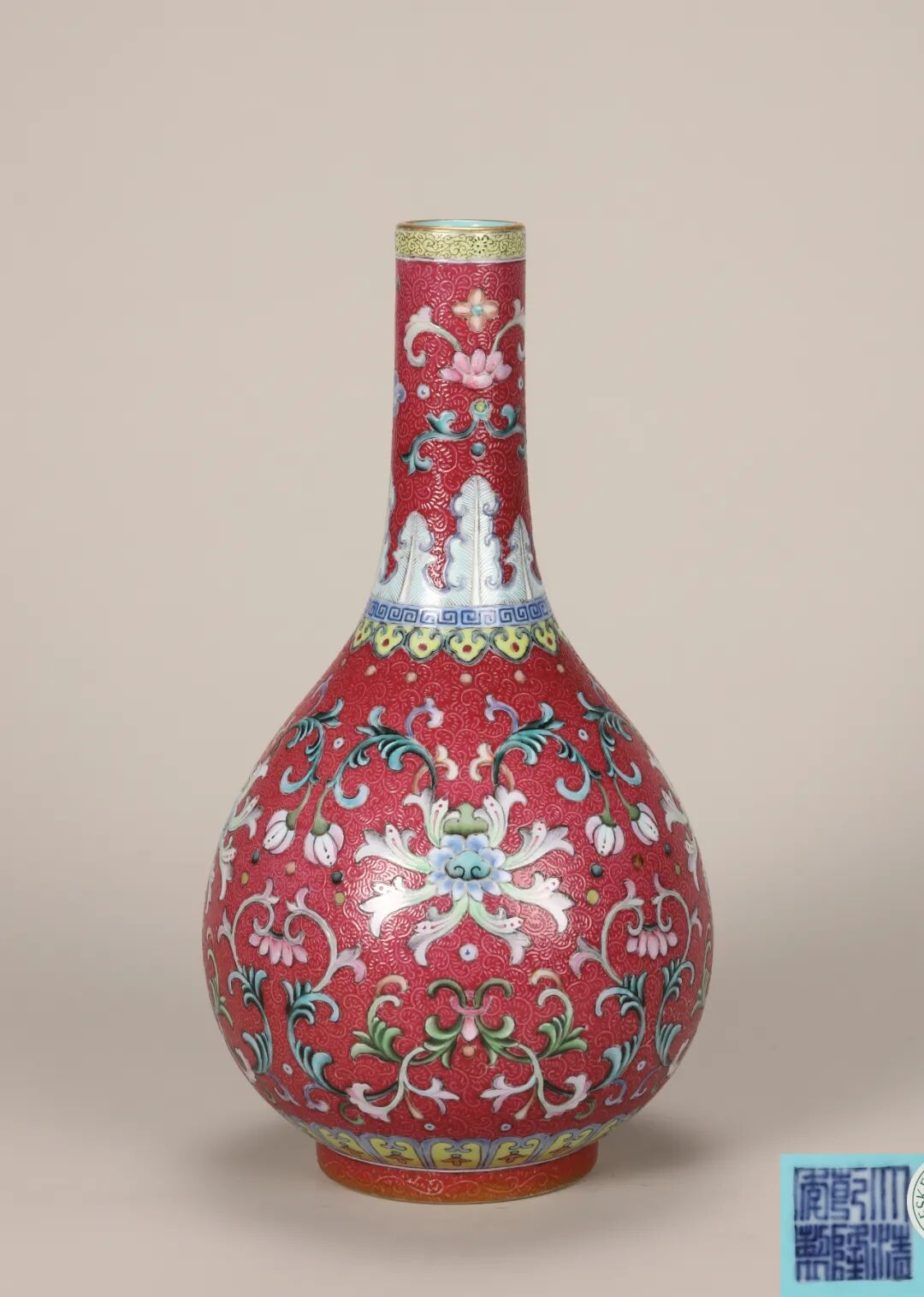 清乾隆轧道洋彩胭脂红地花卉胆式瓶