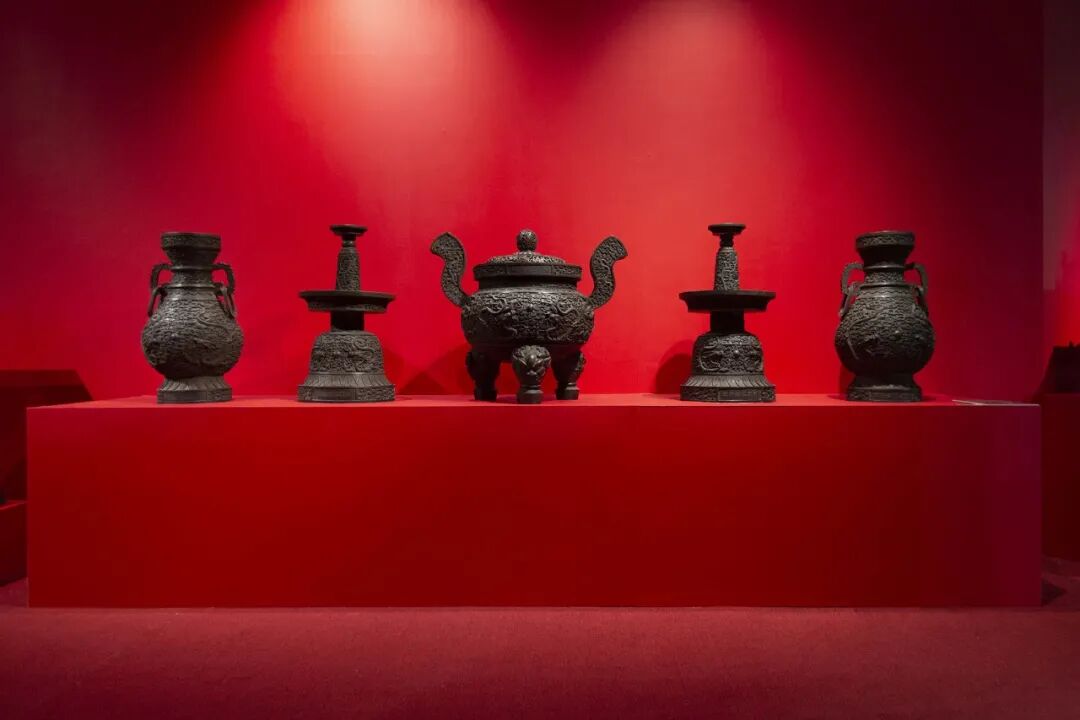 特展现场清乾隆御制铜铸刻二龙争珠图五供