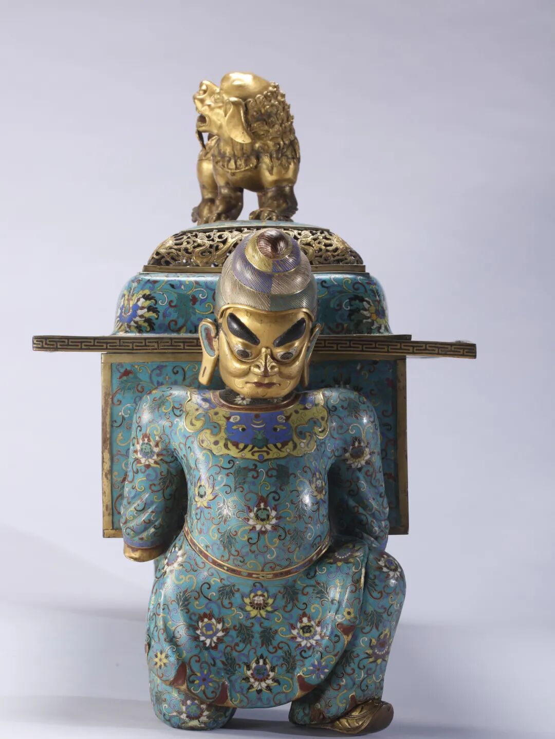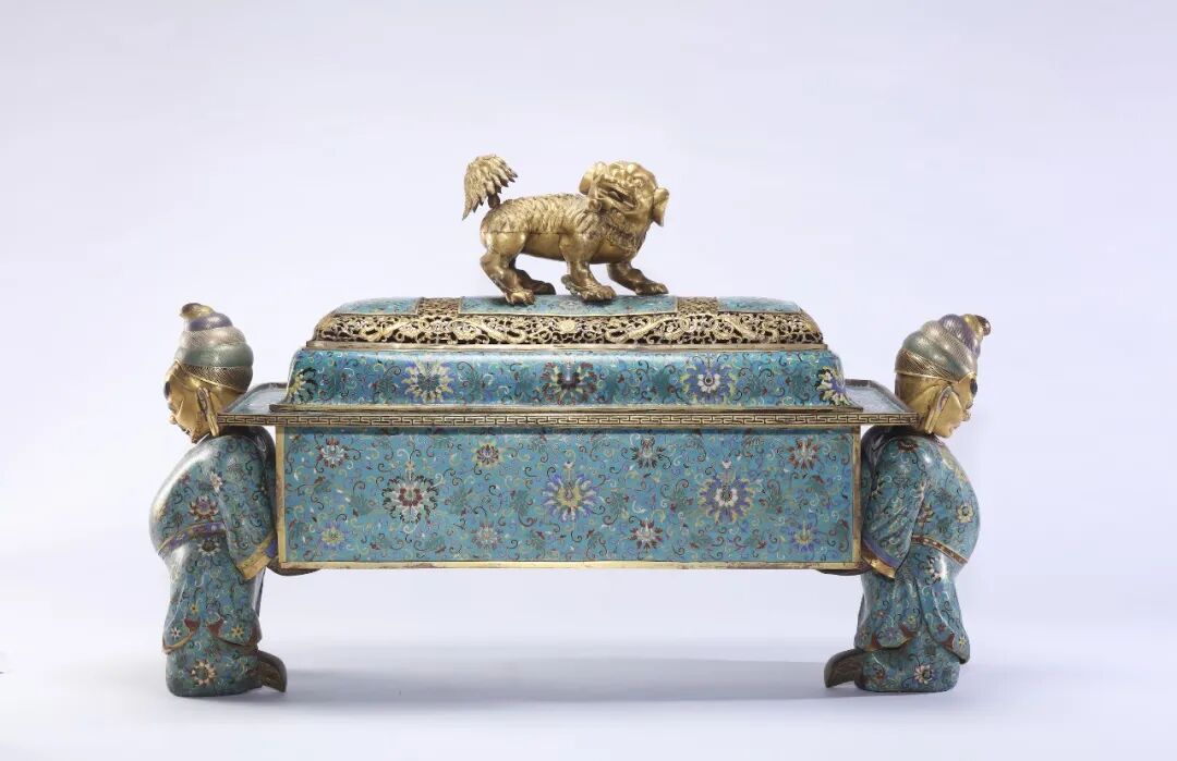 【清中期铜胎掐丝珐琅胡人献宝狮钮大熏炉】,类似形制较大的铜胎掐丝珐琅器通常都是成对制作,英国维多利亚与艾尔伯特博物馆中藏有一件清乾隆铜胎掐丝珐琅香炉。