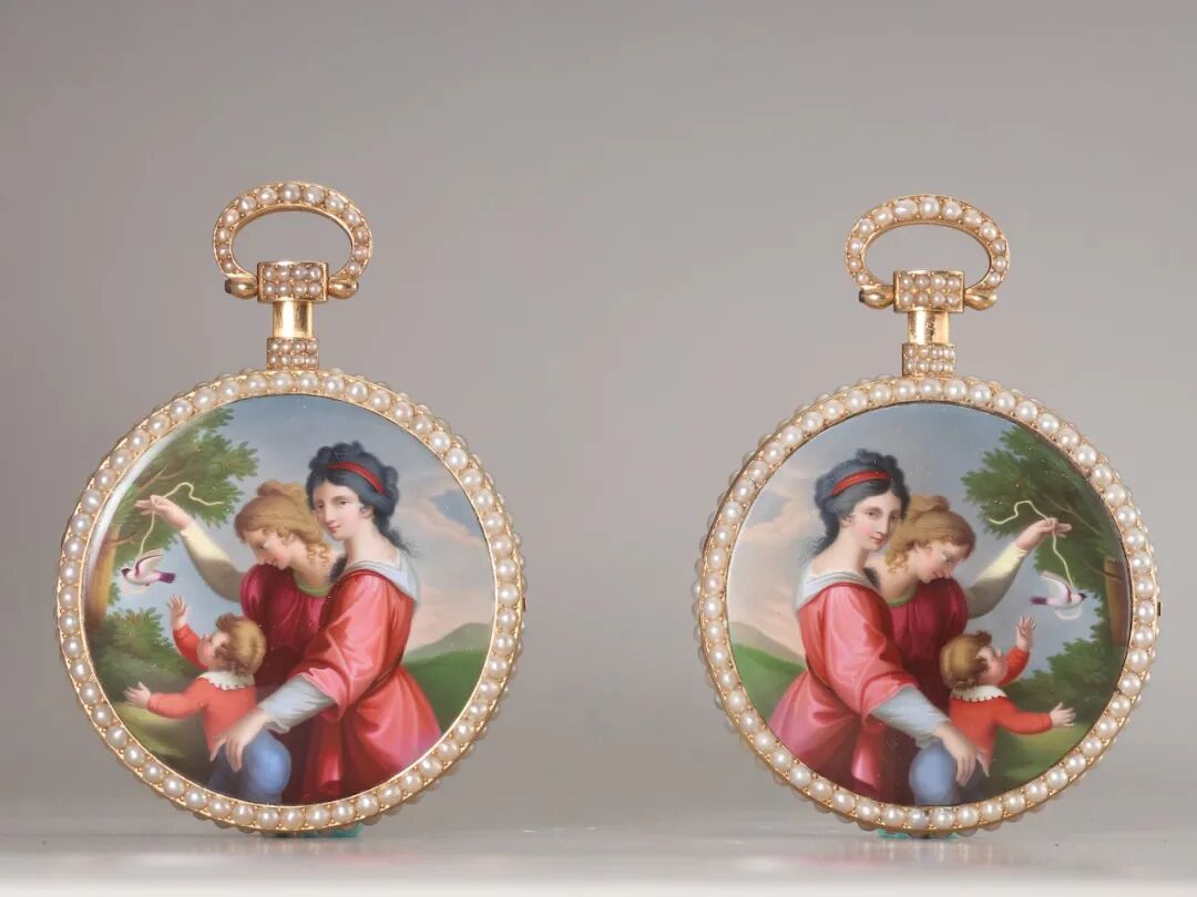 在清宫收藏的欧洲进贡佳品中,亦有小巧精美的怀表佳品。如本次展览的【铜鎏金镶红白玻璃钻怀表】、【“温馨与纯真”(AffectionandInnocence)对表】,为十八世纪至十九世纪初“宫廷怀表”及“中国市场表”之代表作。