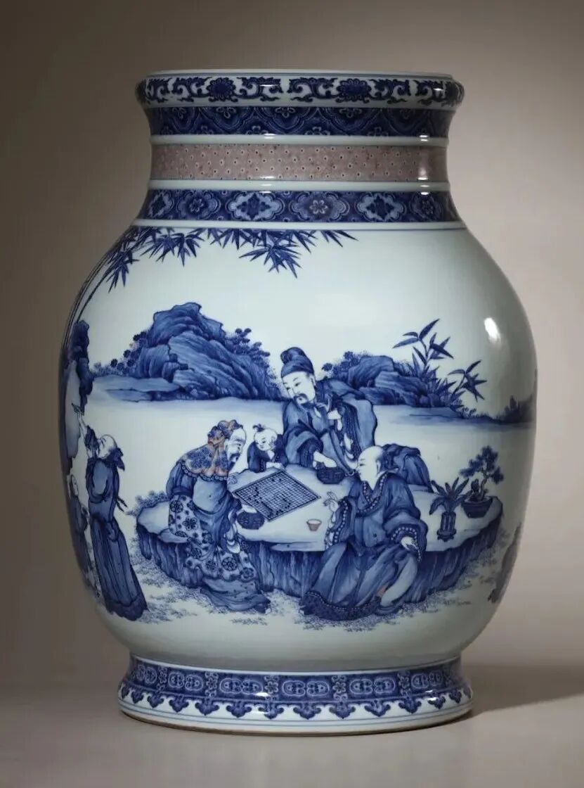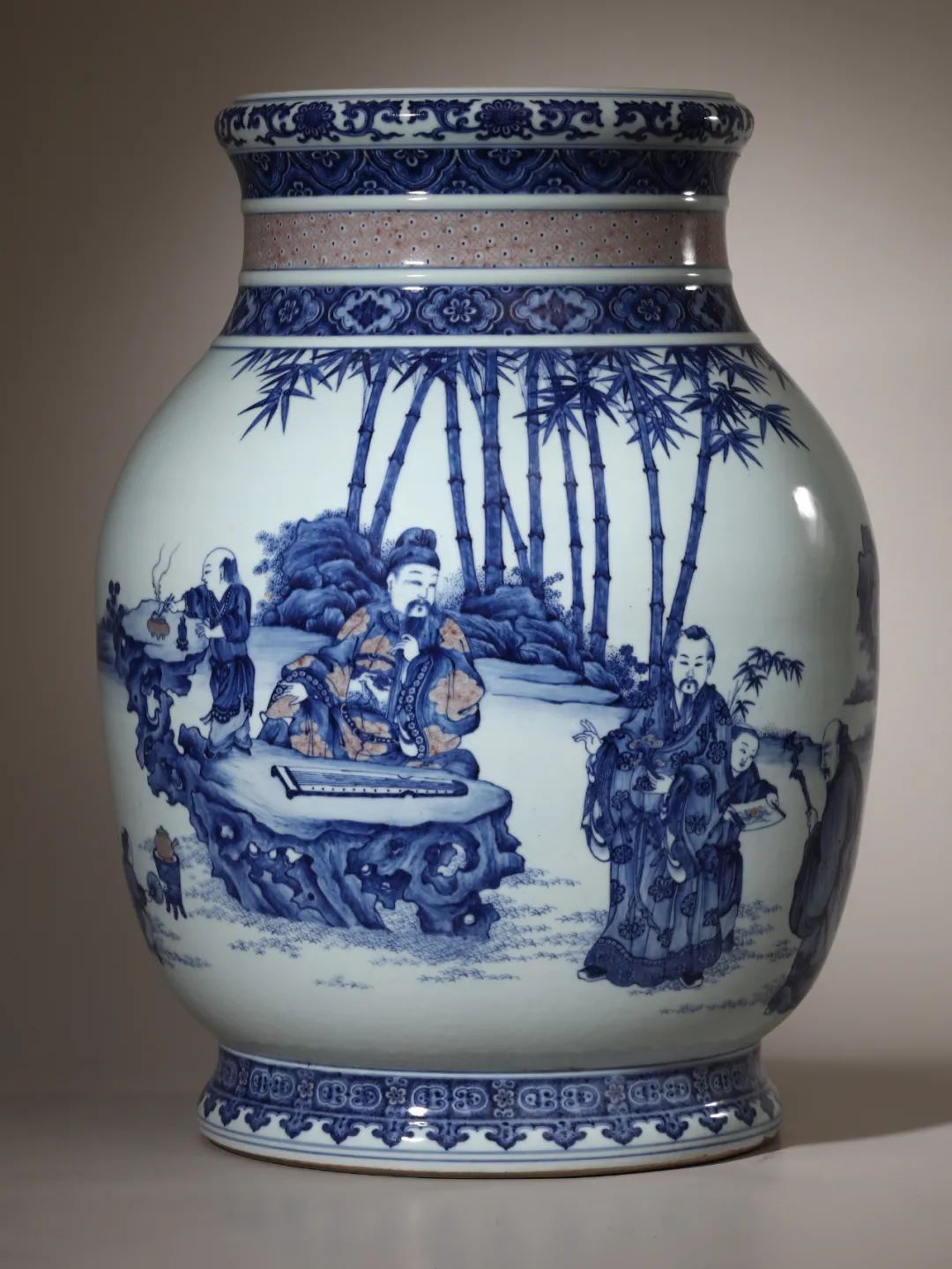 大尊体量恢弘,形似灯笼,通高近五十厘米,口沿、颈部凸起四道弦纹,其间以釉下钴蓝、铜红分绘各式花卉、锦纹,腹部通景绘高士雅集图,但见庭院竹林间,列位高士或焚香抚琴,或展卷论画,或对弈观棋,周围有小童捧砚侍墨、摇扇烹茶。