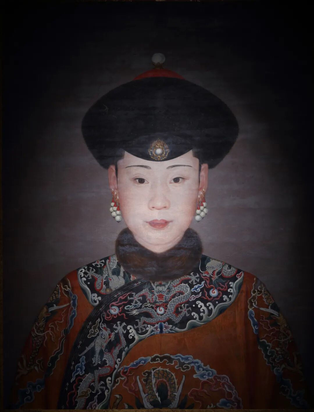 本幅《纯惠皇贵妃油画像》,为唯一一件专家公认的私人收藏郎世宁绘油画肖像。《纯惠皇贵妃油画像》中的女子雍容高贵,神情娴静温婉,正值23岁盛年,身着金黄色缉米珠八团龙冬吉服袍,头戴东珠顶吉服冠,青绒点翠嵌东珠火焰纹金饰眉勒子。