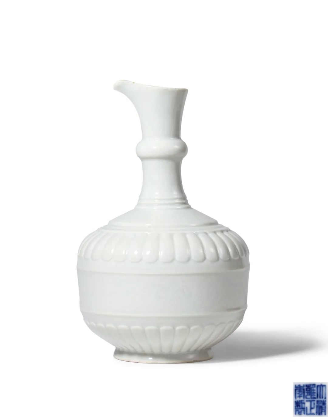 【清雍正白釉模印菊瓣刻缠枝花卉纹花浇】通体施白釉,口部形如凤首,长颈,颈部颈肩凸起一周弦纹,圈足。通体纹饰以暗刻之法,口沿下一周焦叶纹,颈部中央刻朵花纹,下段刻莲瓣如意纹和几道弦纹,肩部刻缠枝花卉纹,腹部刻施缠枝卷草纹,腹部上下模印菊瓣造型,整体格调淡雅素净,纯洁高贵。同款器型线描插图在年希尧《视学》中作为透视画法的本土化实例呈现,可体现御窑厂器物塑形的指导思想。