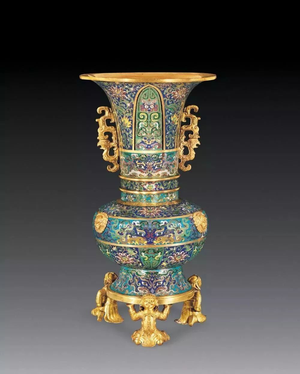 此尊器大敞口,长颈,宽肩,鼓腹,平底,圈足下接跪地胡人形三足。颈部焊接一对螭耳,肩部镶嵌三个狮首形铺首。颈上部和下腹部的蕉叶形轮廓内填豆绿色珐琅釉为地,装饰掐丝饕餮纹,轮廓外饰宝蓝釉地折枝莲纹。颈、腹中部以及圈足外壁施天蓝色珐琅釉为地,装饰掐丝饕餮纹。