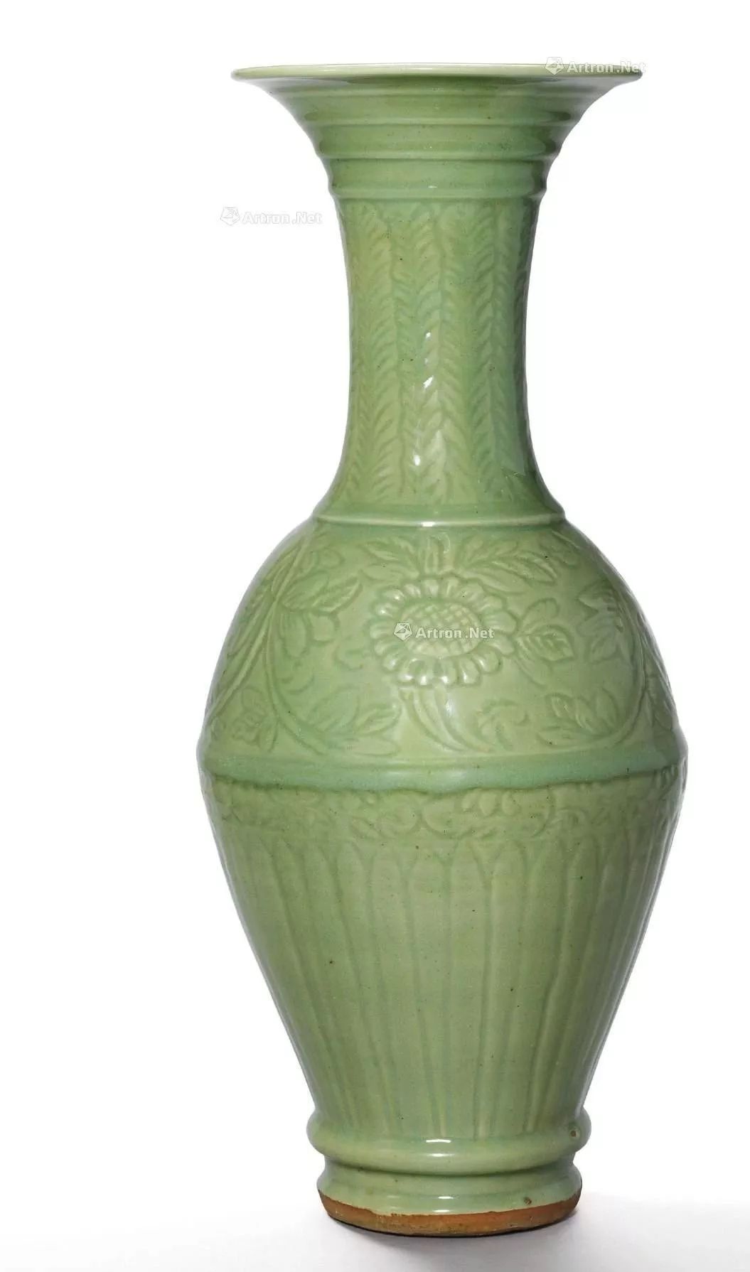 此尊器大撇口,高束颈,颈外刻一圈蕉叶,溜肩鼓腹,肩部上下凸起两道弦纹,中间刻饰三朵缠枝菊花,足下渐收并饰仰菊瓣纹。近足处亦凸起一道弦纹,犹如置瓶于座上。通体施青釉,足底无釉。