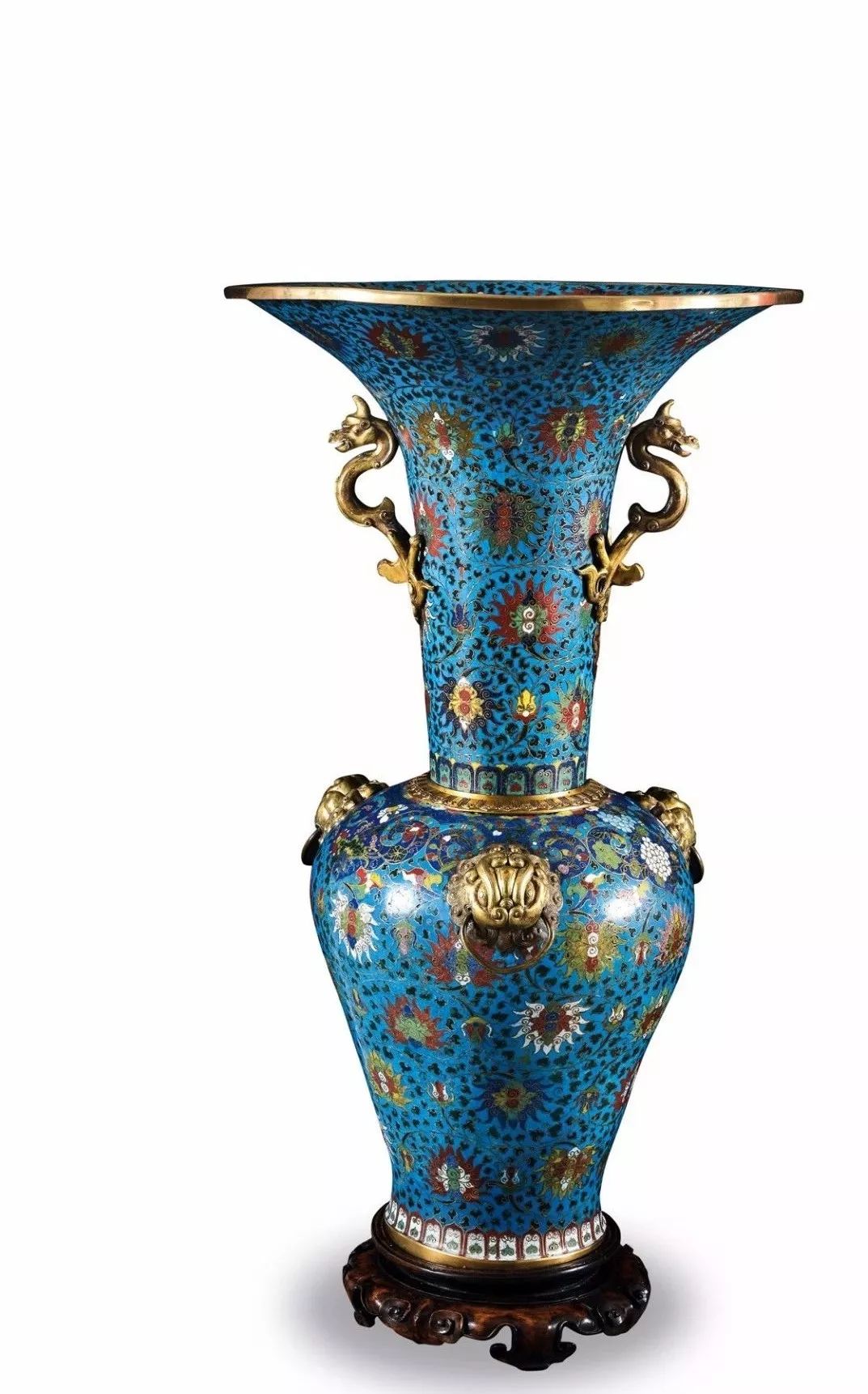 本尊器体量硕大,造型规整,器身修长,敞口外侈,大而近平;束颈长而渐敛,双耳形制优雅,对称布列一对铜鎏金螭龙耳,端庄大气;鼓肩弧腹,等距装饰有三铜鎏金瑞兽衔环;足部下收,平足微撇。整器通施天蓝色珐琅釉为地,敞口内侧亦施釉掐丝花纹,而口沿、颈部结合处、底足及双耳、铺首为铜色,与珐琅的斑斓相映衬,光亮耀眼,精致美观。颈部底端掐丝一周莲瓣纹,与肩部结合处的铜鎏金莲瓣纹相映衬;下方饰如意云头式开光,其内满饰缠枝花卉果实,如绣球花、秋海棠、牡丹等,设色丰富,极具装饰意味。