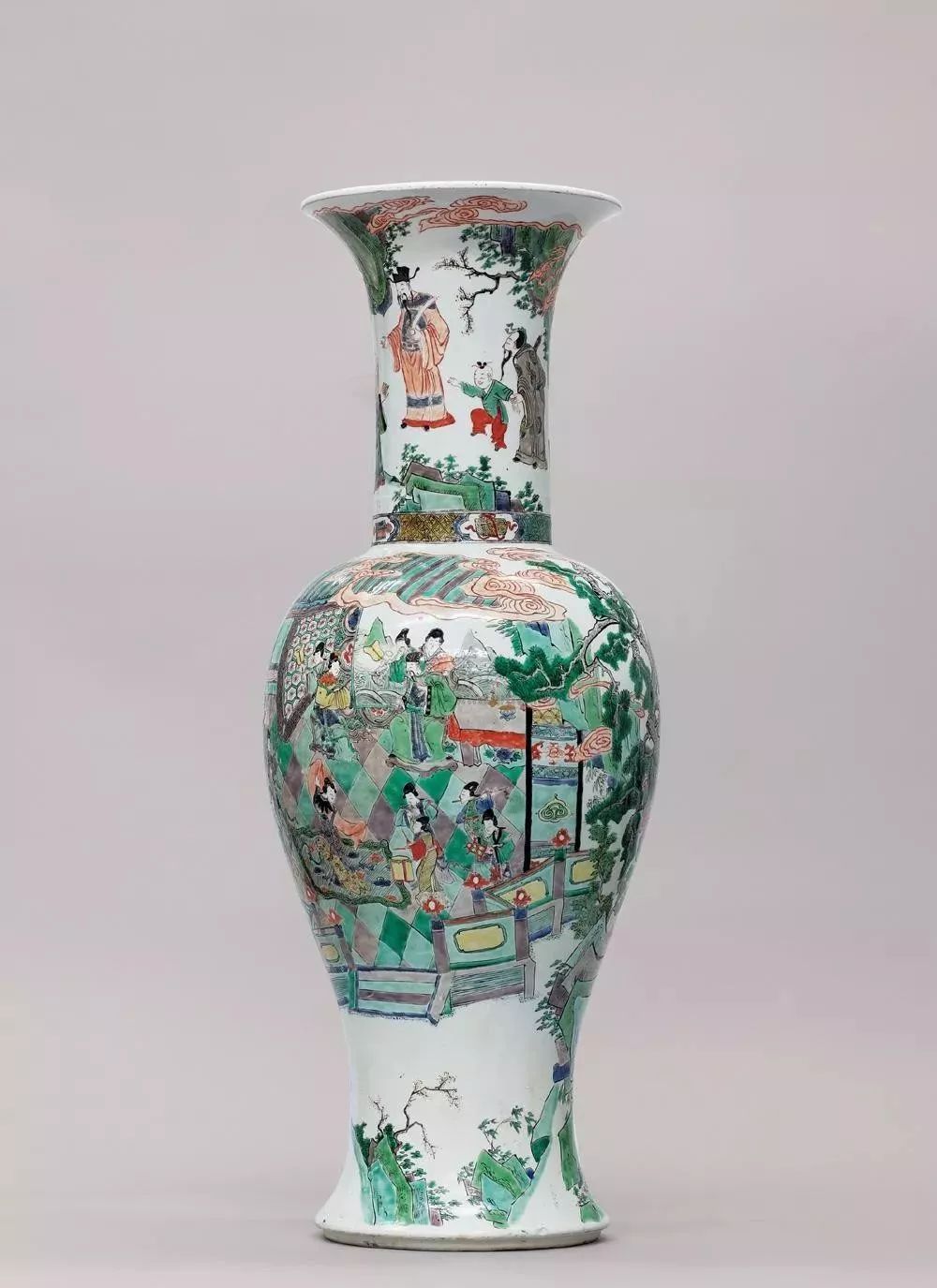 本尊撇口直颈,丰肩鼓腹,胫部修长,足端外撇,器形硕大恢宏,端正庄严,极具震撼力。尊通体以五彩描绘,腹部主体一侧先以红、绿、紫等诸色彩绘制一座富丽堂皇的楼阁,厅堂正中一队乐女或抚琴,或吹箫,或摇铃,或鸣金,大堂正中地毯之上,只见一舞女高挽发髻,霓裳翠袖,翩翩起舞,女子面容端庄清秀,体态纤丽修长,气质高雅恬静,宛若天仙,家中主人夫妇则端坐于厅堂之上,慈眉笑目,欣赏舞蹈,瓶体另一侧则描绘两棵高耸如云的参天古松,直冲云霄。