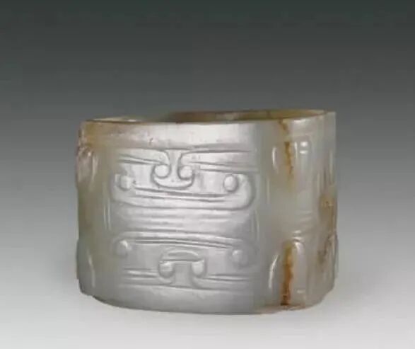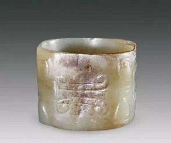 这件琮形玉镯四个角面上的简化兽面纹与四壁的竖槽特征,似与良渚文化玉琮有联系,但又不是良渚文化玉琮,因为在目前发现的良渚文化玉琮中没有见到此类形制与纹饰的玉琮,因此推测其可能是良渚文化之后的作品。