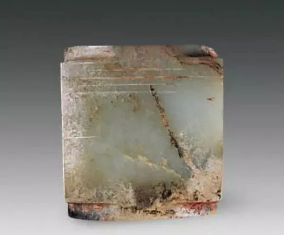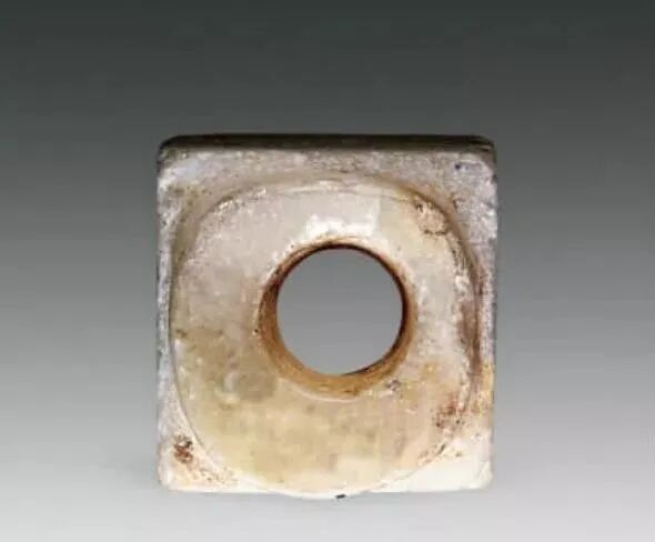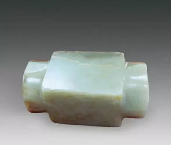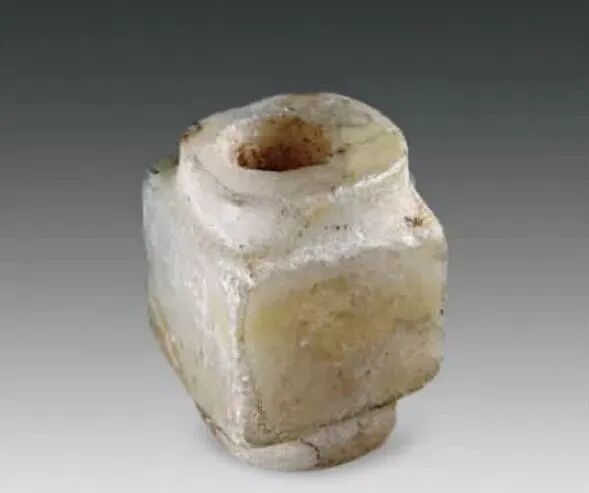 这件玉琮也是一件改制品,是由外方内圆矮体素面玉琮改制的。这件玉琮呈乳白色,与甘肃临夏罗家湾玉琮玉色相同,王质可能也相同(图一六)[11]。据此推测,这件玉琮是由齐家文化的外方内圆矮体素面玉琮改制的。