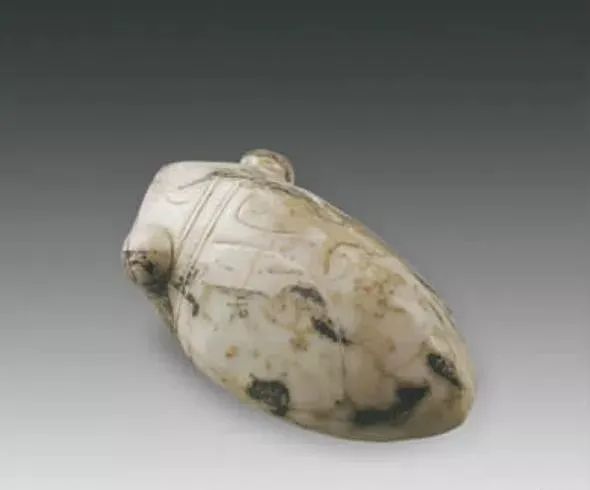 妇好墓M5∶53石蝉,大理石质(经检测为蚀变碳酸盐岩),白色夹黑斑。圆雕,横断面呈三角形隆起,并形成由喙尖至尾端的脊背棱。三角形大头。喙部前凸呈三角形,并施刻三角线纹;喙部上端刻一对凹弧相对的弧线。喙部下减地雕出长三角形带纹,延长至腹部收尖,其上单线阴刻7道折角线,接近腹底的尖部阴刻X形单线。两眼凸出呈半圆球状。颈部施刻两道双勾阴刻阳纹。脊背正中单线阴刻蝉纹,蝉纹呈长桃形,上端内勾呈卷云状。脊背两侧单线阴刻弧线成宽短翼纹。脊背下部沿脊棱而下单线阴刻四道以脊棱为中心点的连弧线,象征蝉腹部的节理纹。尾部收尖。腹下雕出左右一对长方形足。长13.8、高6厘米(图一四)。这件石蝉颈部的两道双勾阴刻阳纹与脊背正中的蝉纹,为典型的武丁时期玉石雕作品的施纹特征,但蝉纹为单线阴刻,而不是双勾阴刻阳纹,似为偏早的施刻纹饰特点,因此推测这件石蝉可能是武丁前期的作品。